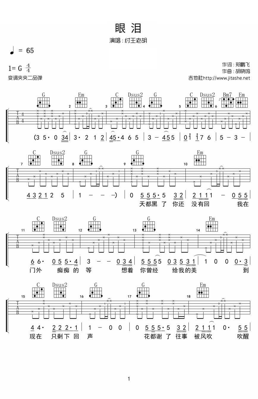 纣王老胡演唱,眼泪吉他谱,G调六线谱,变调夹第二品弹,高清图片谱编配。眼泪吉他谱...