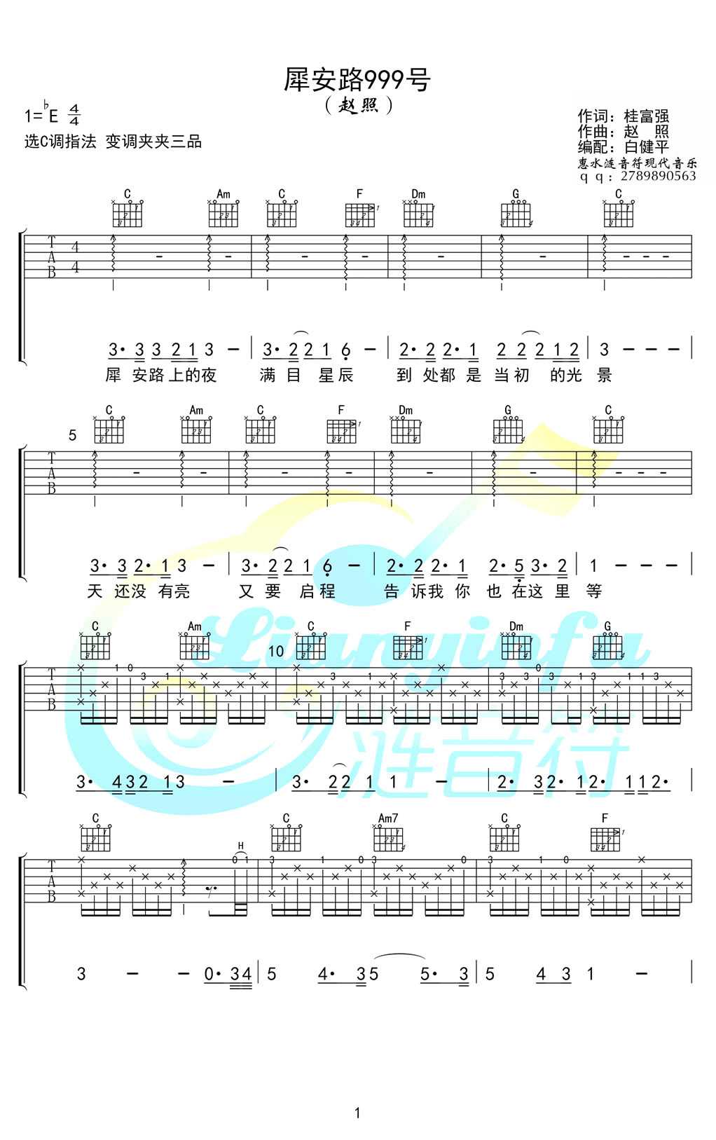 赵照犀安路999号吉他谱,一首为西南交大写的校歌,原调降E,选C调指法变调夹夹3品。《犀安路999号》吉他谱,六线谱完整版四张图片两页展示。...