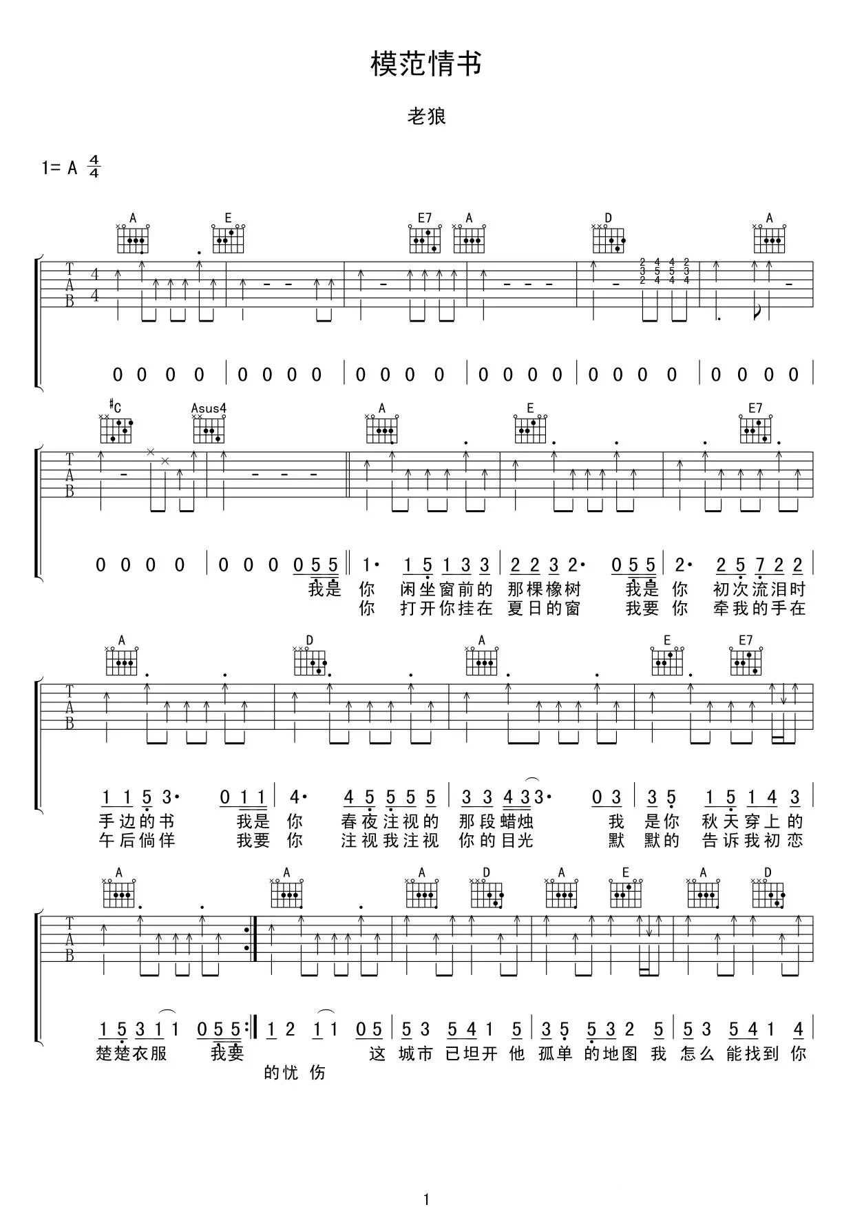 老狼模范情书吉他谱,A调指法编配,模范情书吉他弹唱谱,六线谱图片高清版本。原调编配变调夹0品...