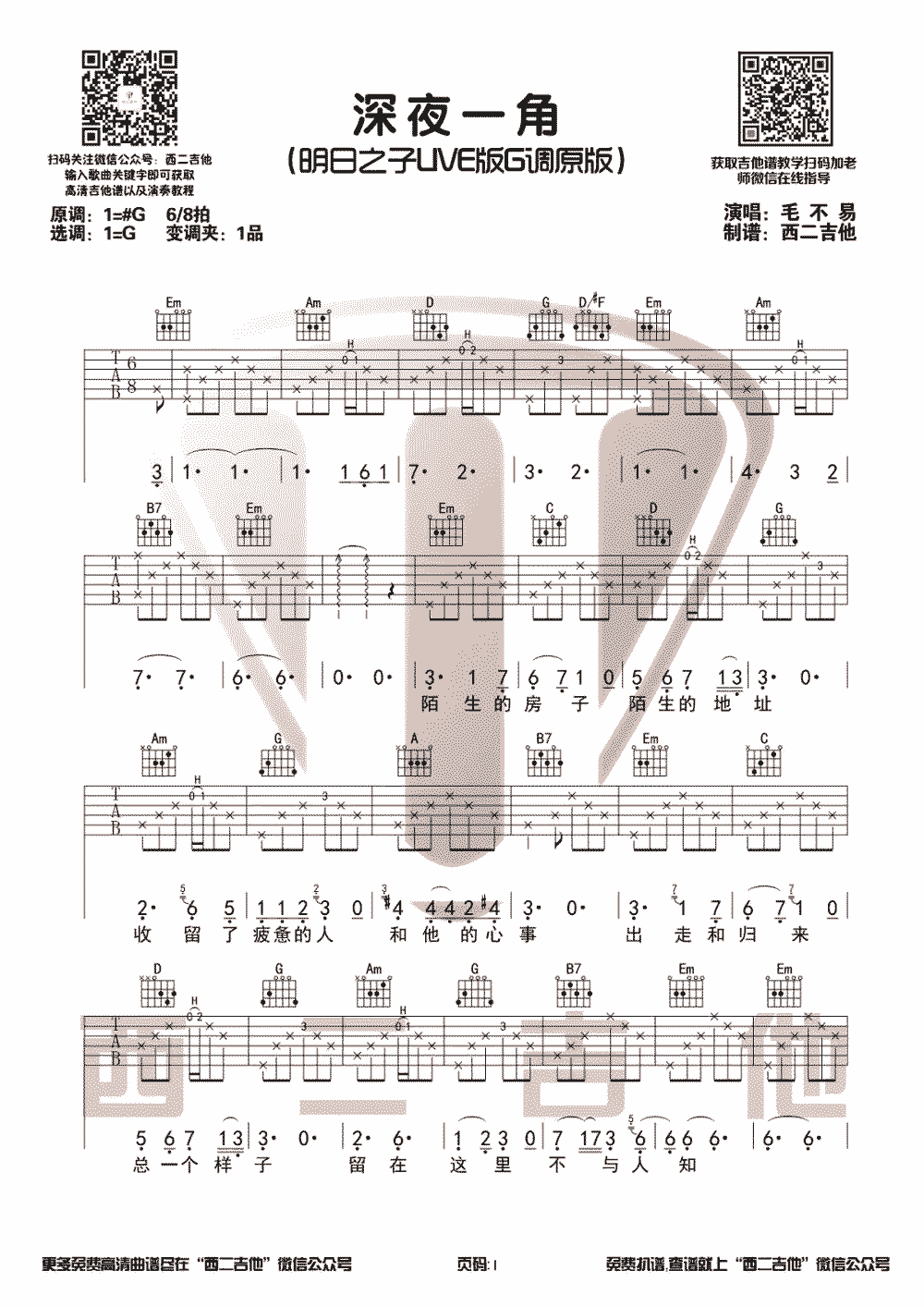 吉他深夜一角 吉他谱-毛不易 六线谱 西二吉他