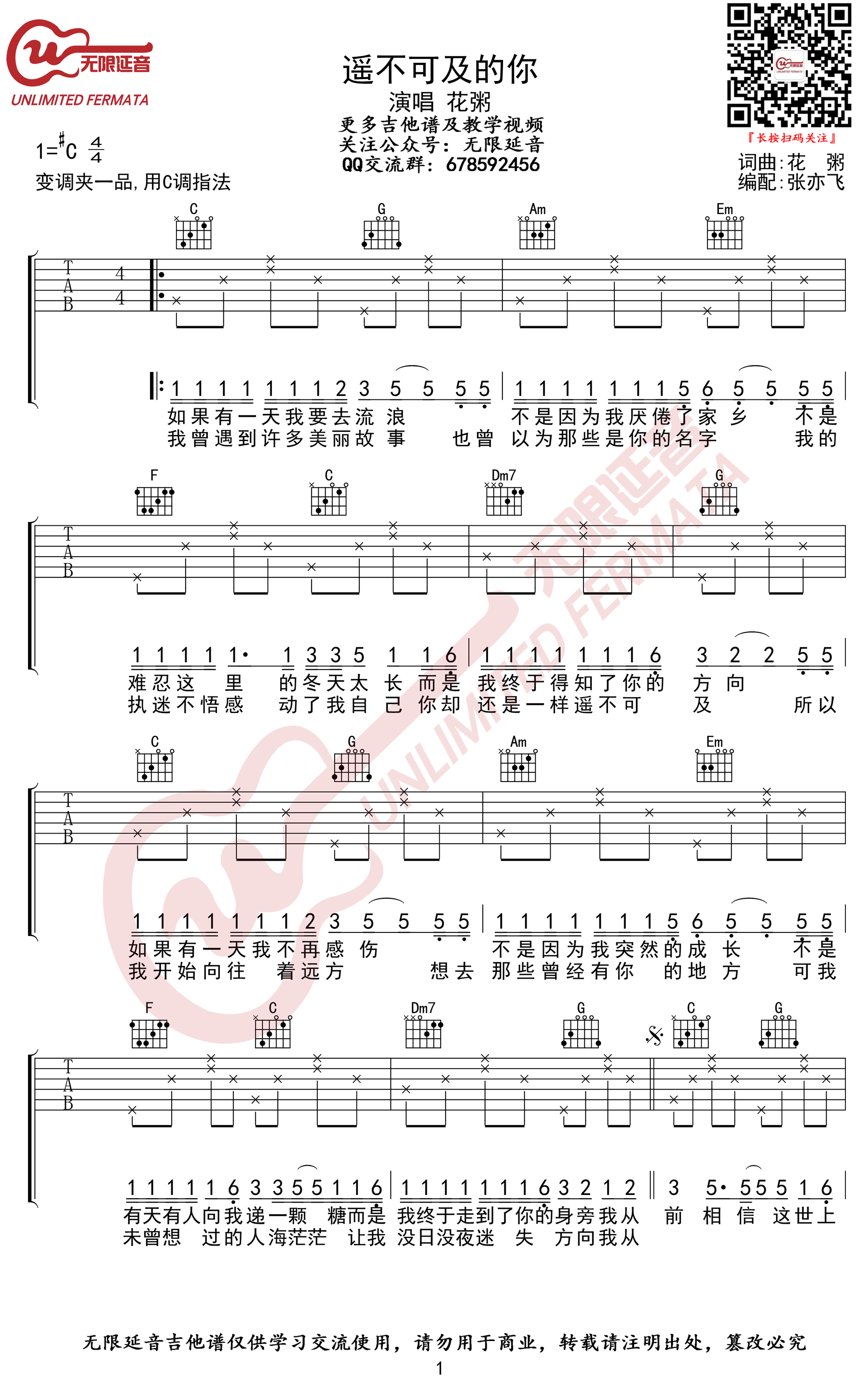 《遥不可及的你》吉他谱,花粥演唱,C调指法编配,变调夹夹第一品。遥不可及的你六线谱,两张高清弹唱图片谱。无限延音制谱出品...