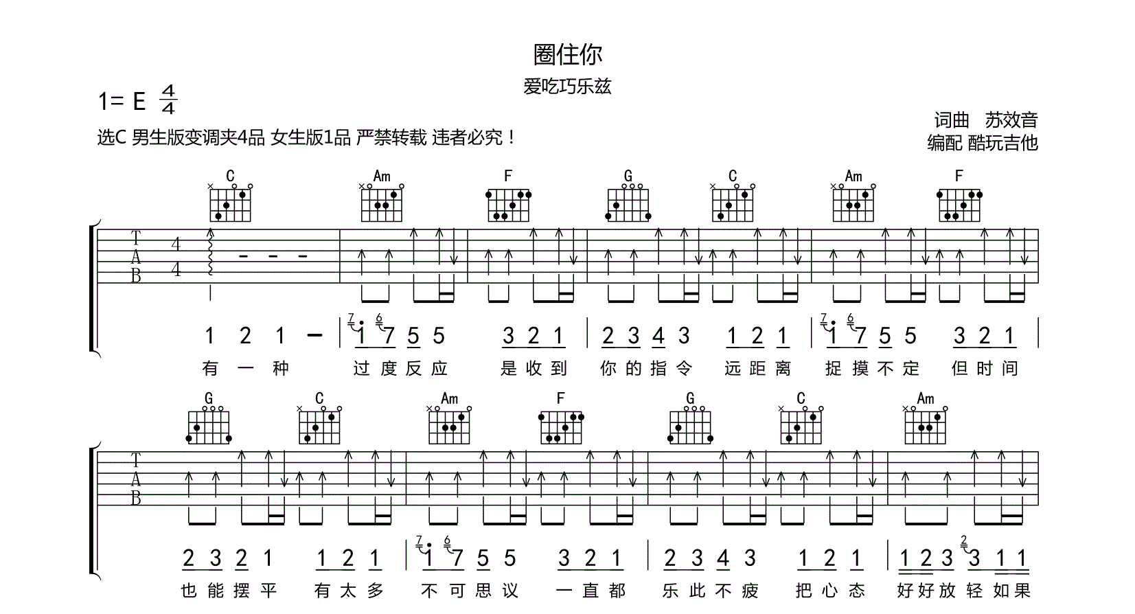吉他圈住你 吉他谱 一口甜/ 爱吃巧乐兹 六线谱 还原附间奏尾奏