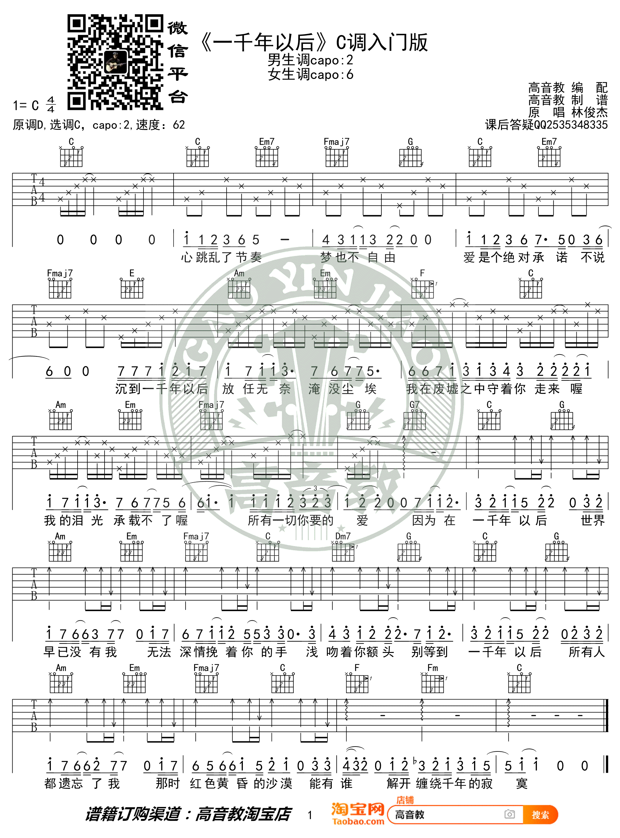 林俊杰《一千年以后》吉他谱,C调入门版,原调D,变调夹男生调夹二品,女生调夹六品。一千年以后六线谱,高清弹唱图片谱。高音教出品...