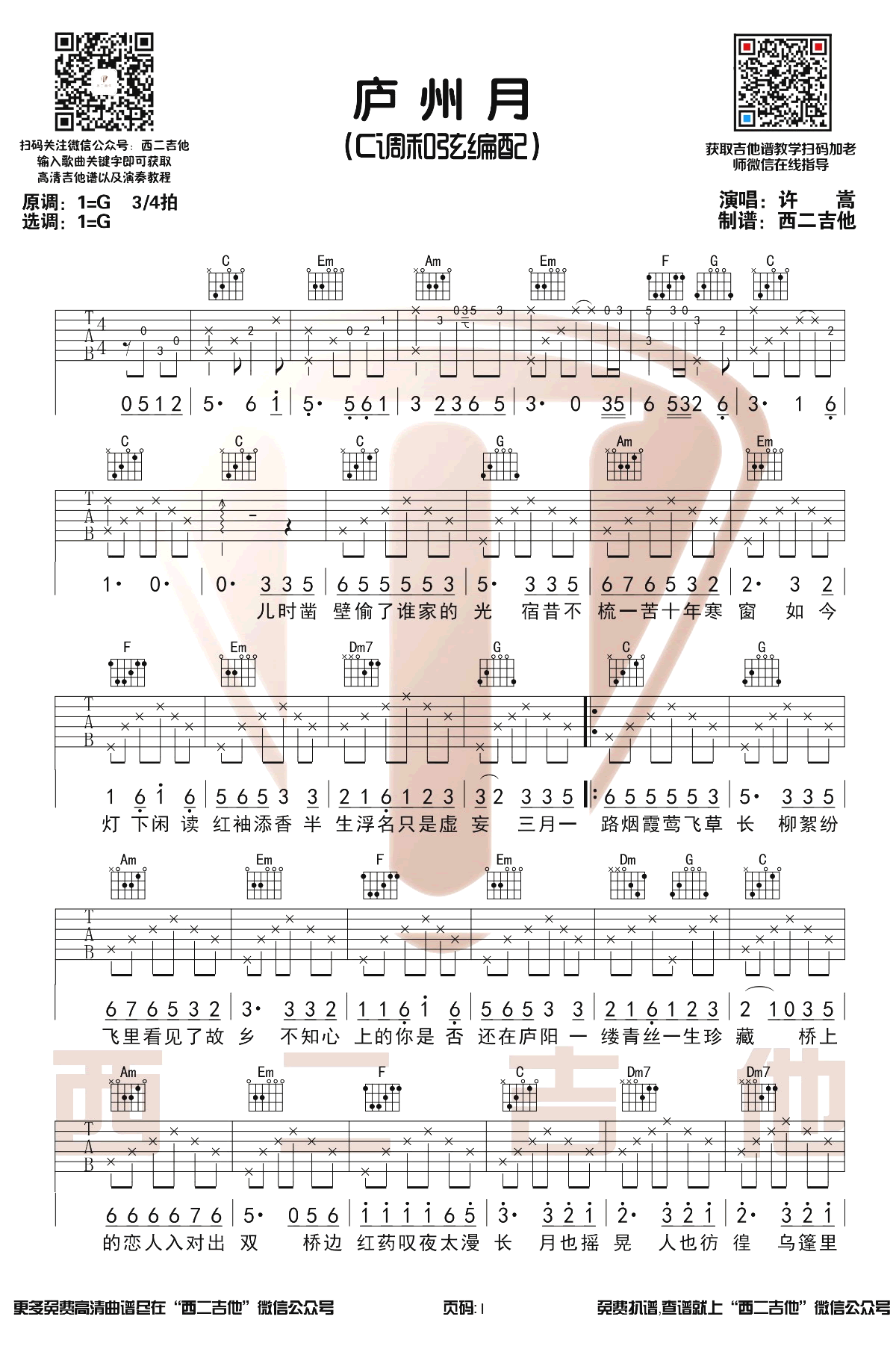 庐州月吉他谱,许嵩演唱的一首绵延一贯的中国风清新,充满了行云流水细腻的韵味,庐州月六线谱,C调和弦编配,三张图片谱。西二吉他编配...