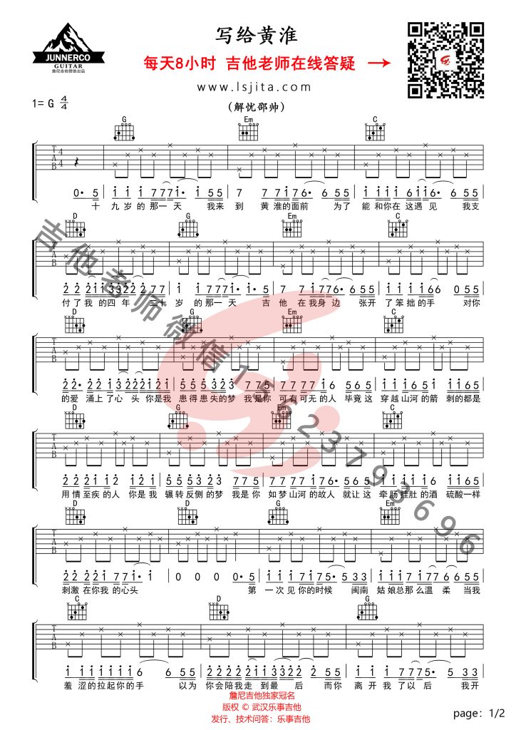 吉他解忧邵帅《写给黄淮》吉他谱 G调弹唱谱