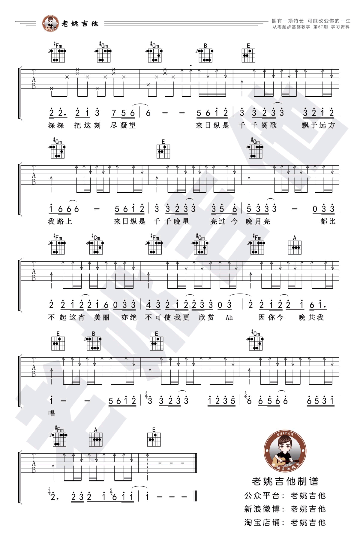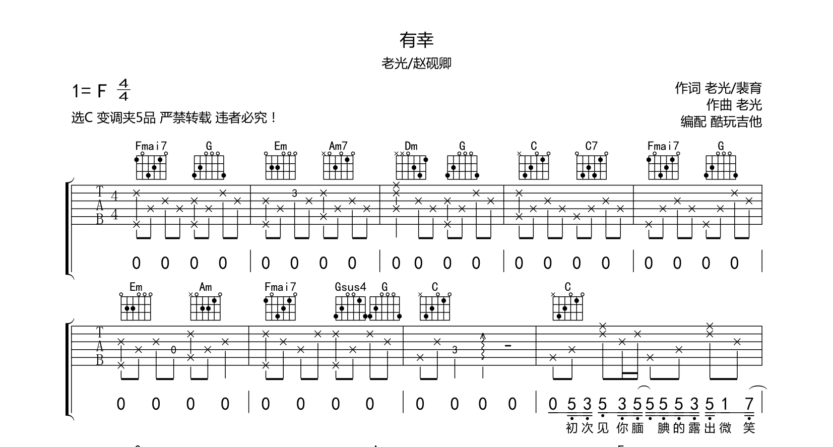 有幸吉他谱老光/赵砚卿原调F选C变调夹5品按照原版编配音频为手机录制酷玩吉他编配制谱曲谱版权归酷玩吉他所有未经本人同意严禁转载。...