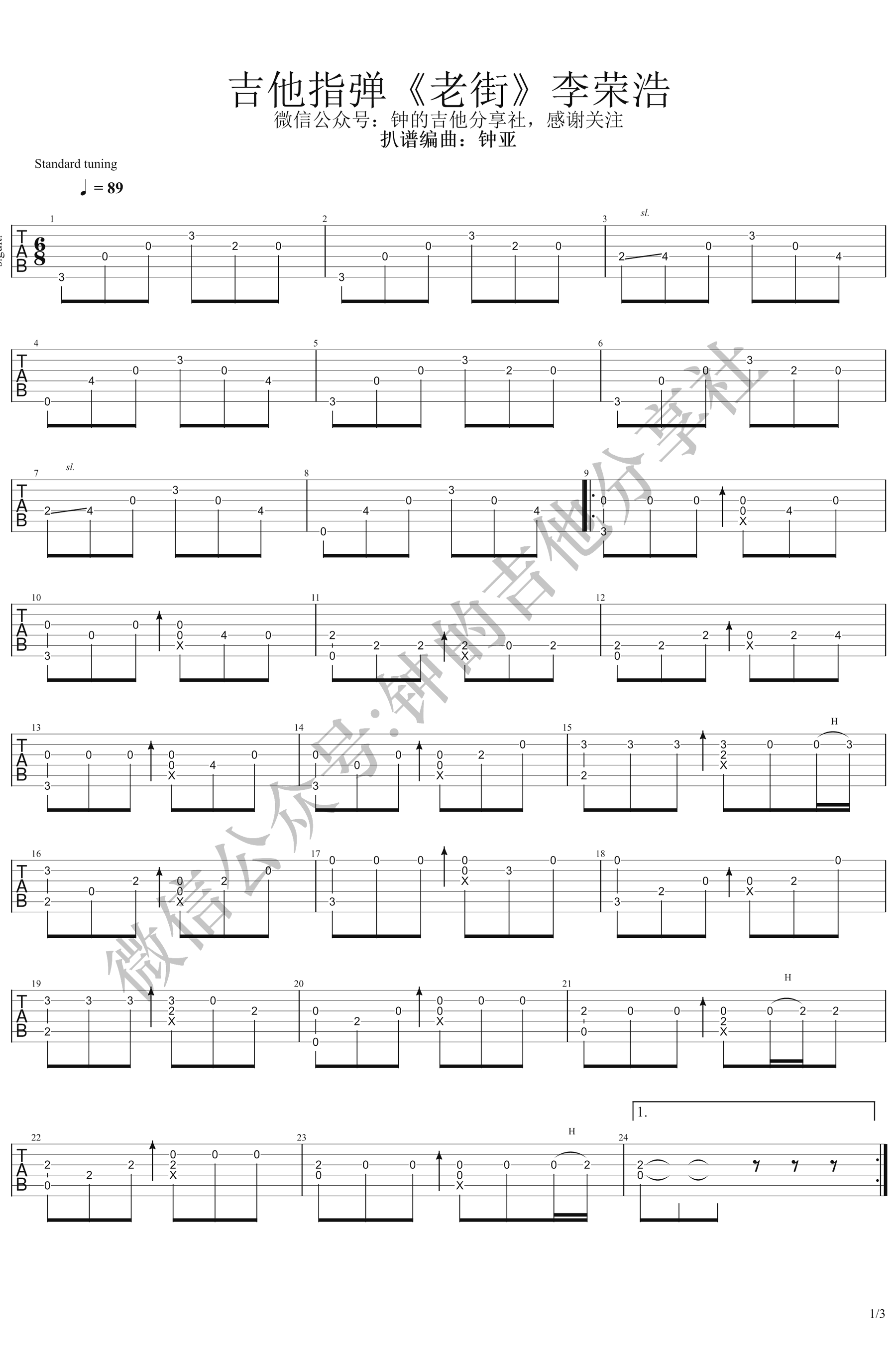 老街吉他独奏谱,原曲F调,86拍的歌曲,降半音调弦,标准调弦声音也不错,G调指法改编...