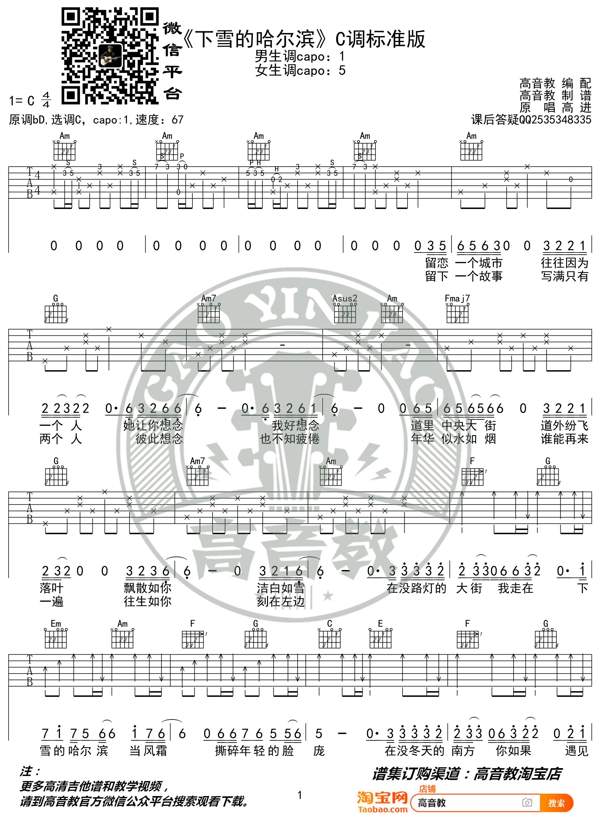 下雪的哈尔滨吉他谱,歌曲原调bD调,弹奏的时候选用C调编配,男生变调夹夹1品,女生变调夹夹5品,下雪的哈尔滨C调标准版,吉他弹唱六线谱,曲谱由高音教编配并上传,浙江卫视《中国好声音》第二期...