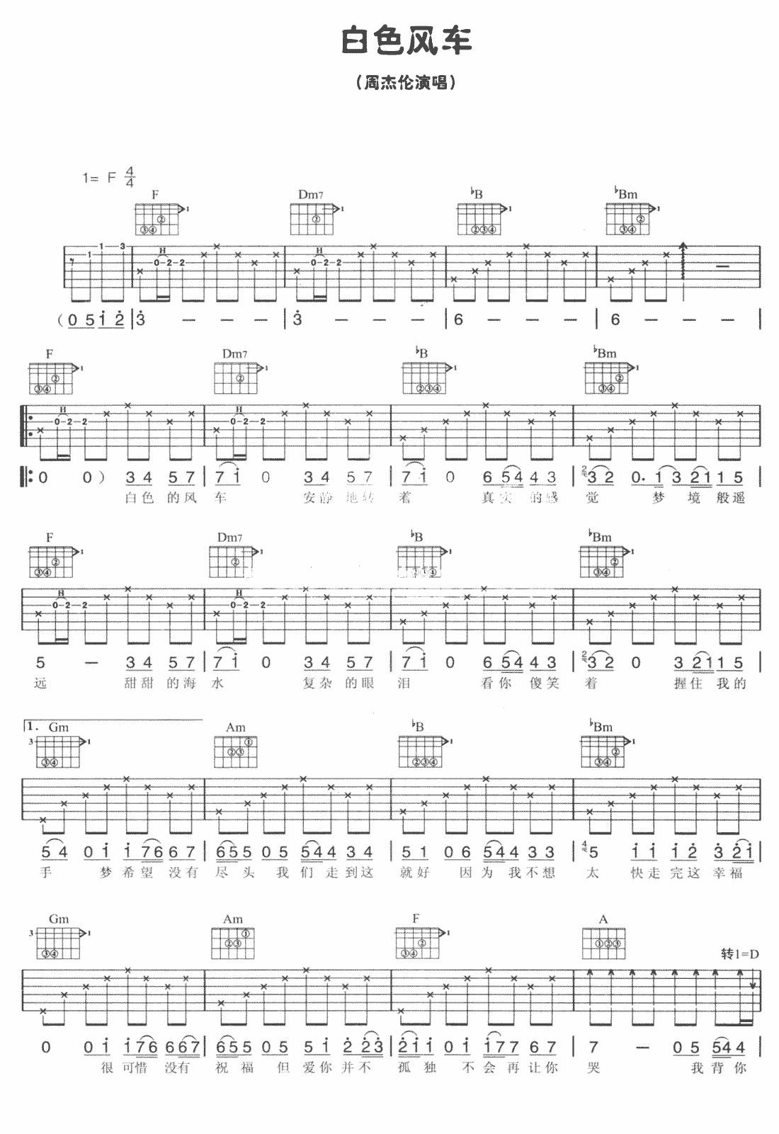 白色风车吉他谱,曲白色风车吉他谱,曲谱采用F调和弦编配。周杰伦《白色风车》吉他谱,曲谱共三页图片六线谱。谱采用F调和弦编配。周杰伦《白色风车》吉他谱,曲谱共三页图片六线谱。...