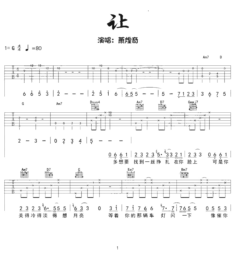 让吉他谱,选G调和弦编配,节拍80,萧煌奇《让》吉他弹唱谱,一共4张图片六线谱。...