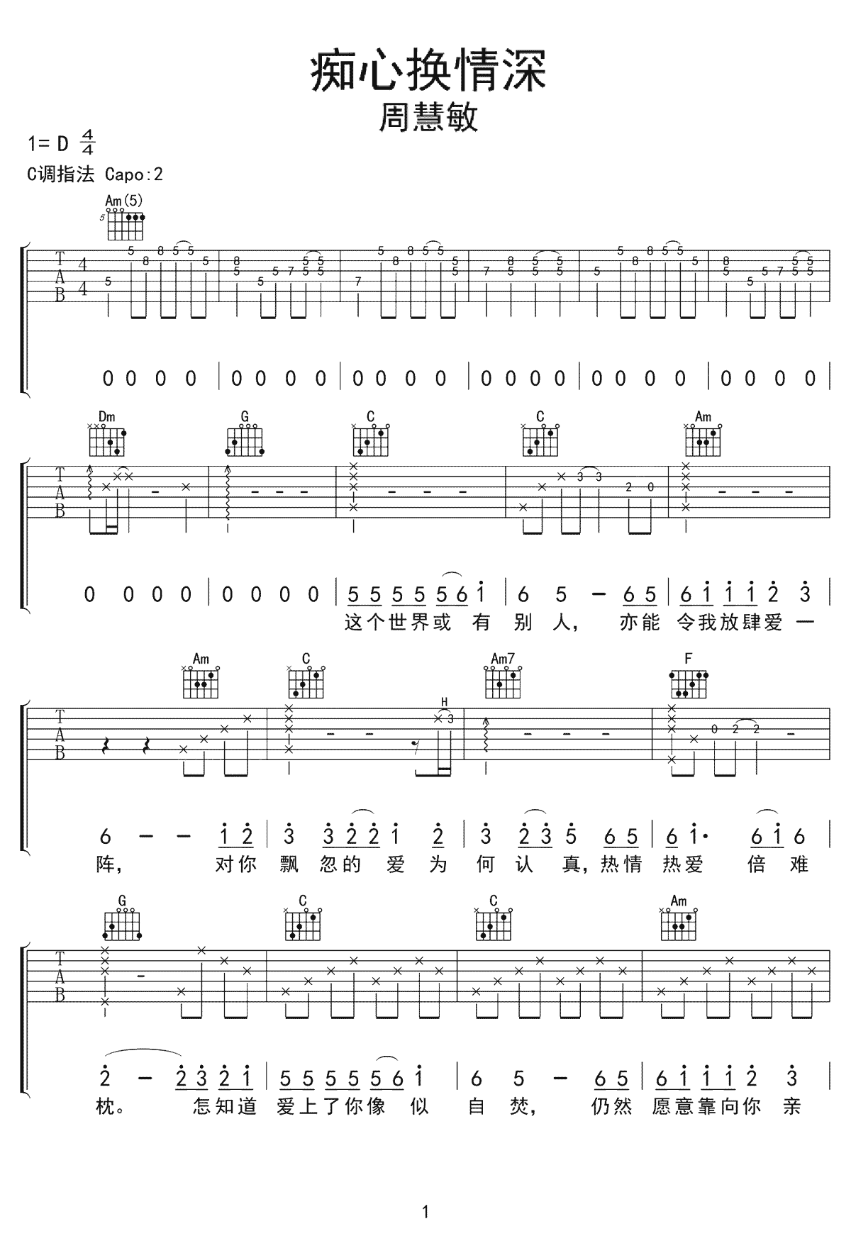 痴心换情深吉他谱,原调:1=D,选C调和弦编配,CAPO:2。周慧敏《痴心换情深》吉他弹唱谱,共两页高清图片六线谱。...