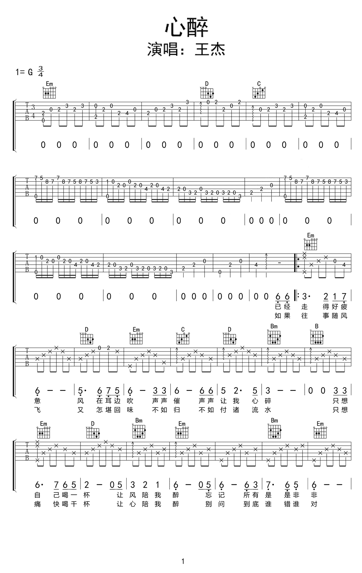 心醉吉他谱,选G调和弦指法编配。王杰《心醉》吉他弹唱谱,共有两页高清图片六线谱...