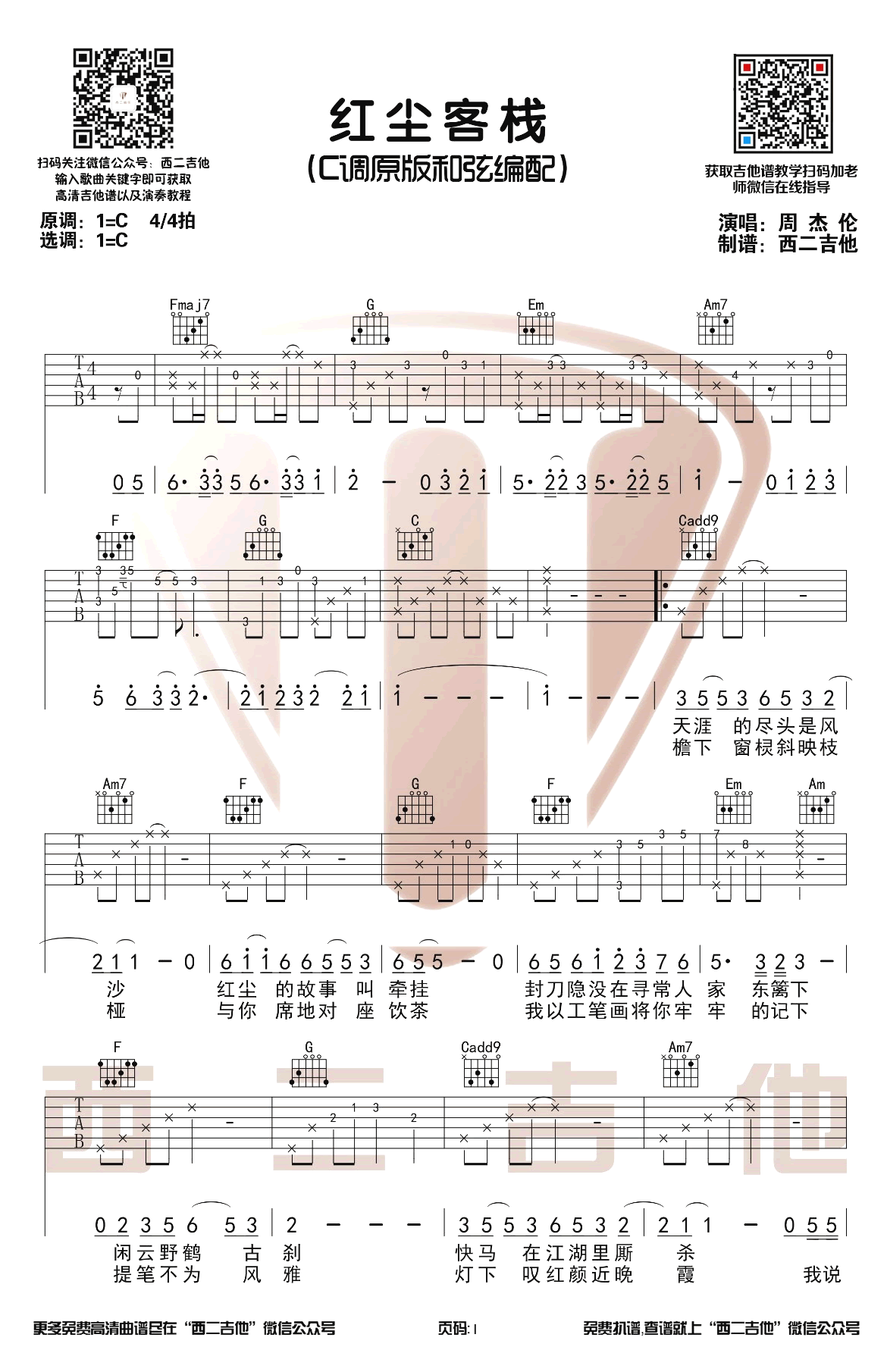 《红尘客栈》吉他谱,周杰伦的一首经典古风歌曲,红尘客栈六线谱,C调和弦弹唱谱,带有原版前奏,西二吉他编配...