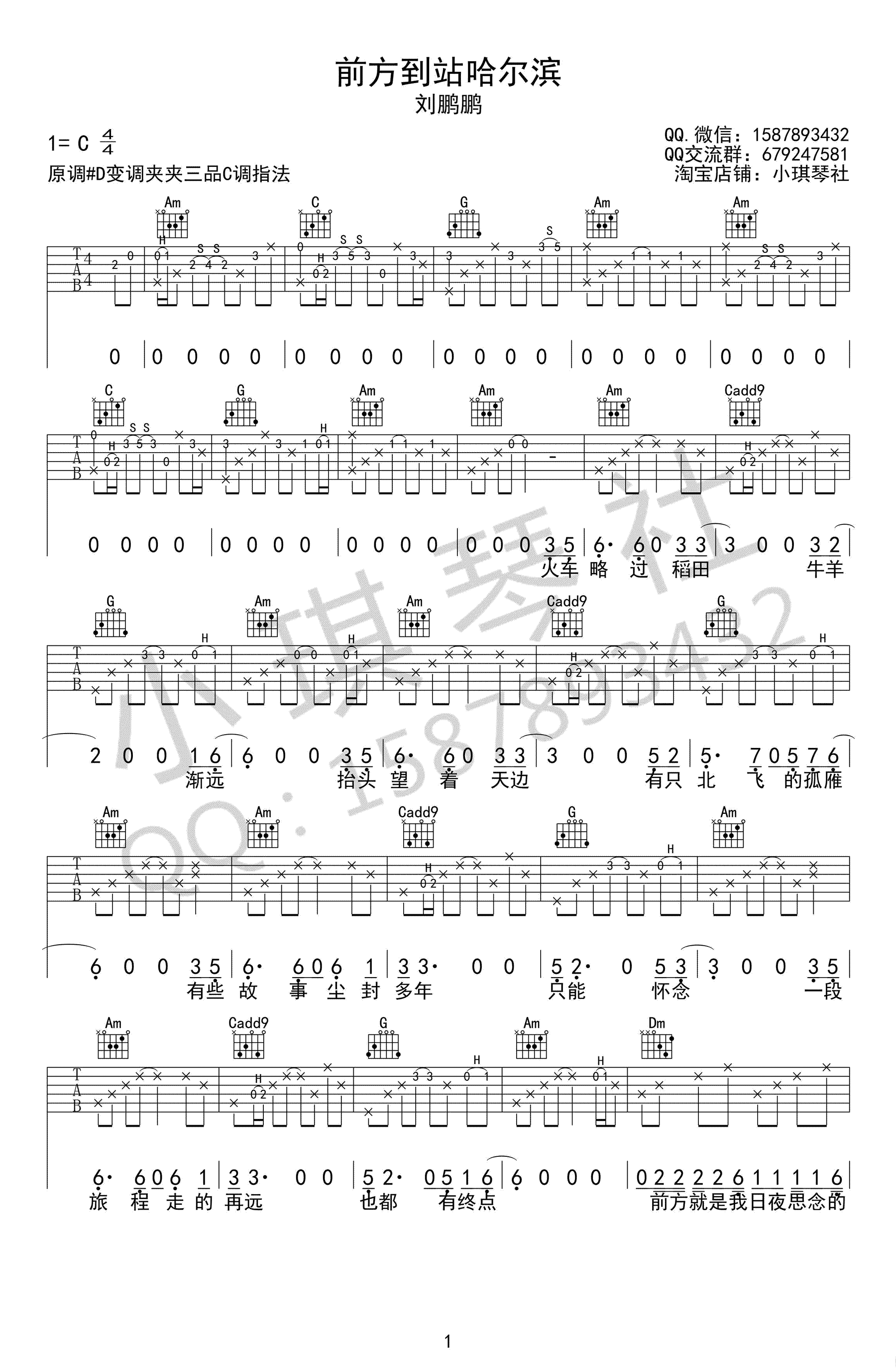 刘鹏鹏《前方到站哈尔滨》吉他谱,原调#D,变调夹夹三品,C调指法,感谢小琪琴社编配。...