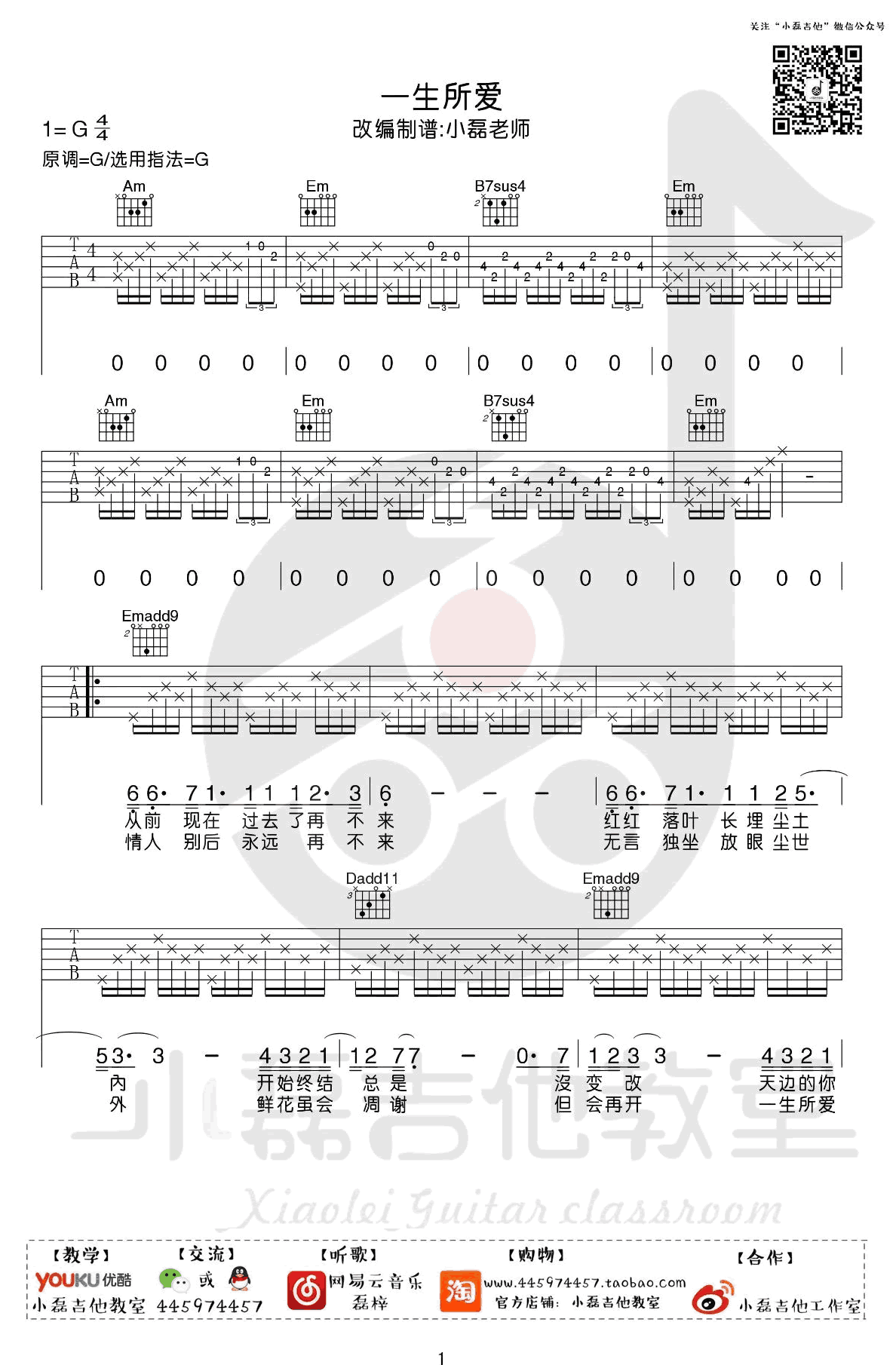 卢冠廷《一生所爱》吉他谱,原调G,选用G调指法编配,周星驰经典电影《大话西游大圣娶亲》片尾曲。感谢小磊吉他出品...
