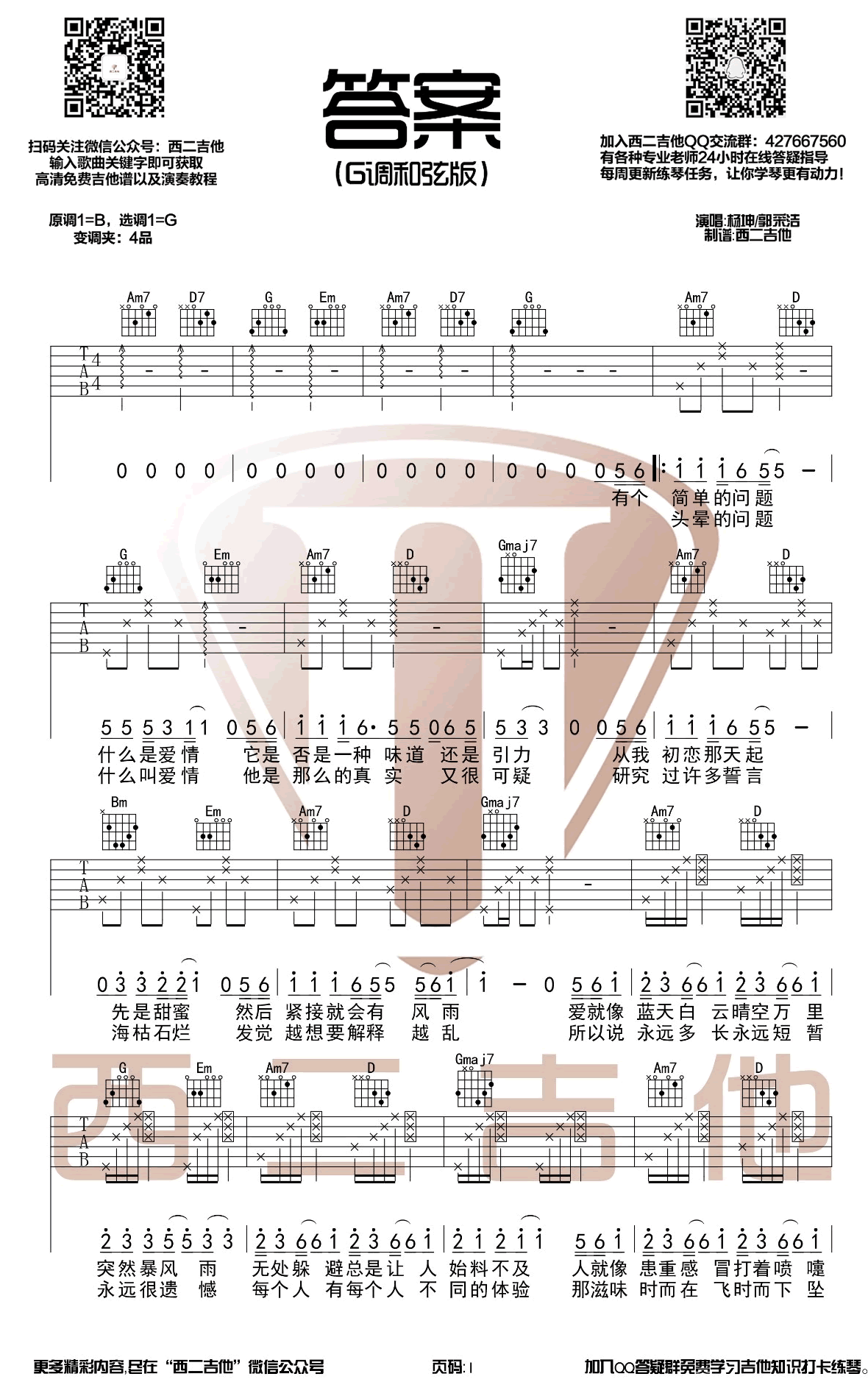 答案吉他谱,原调B,选调G,变调夹夹第四品。感谢西二吉他编配和提供弹唱演示视频。...