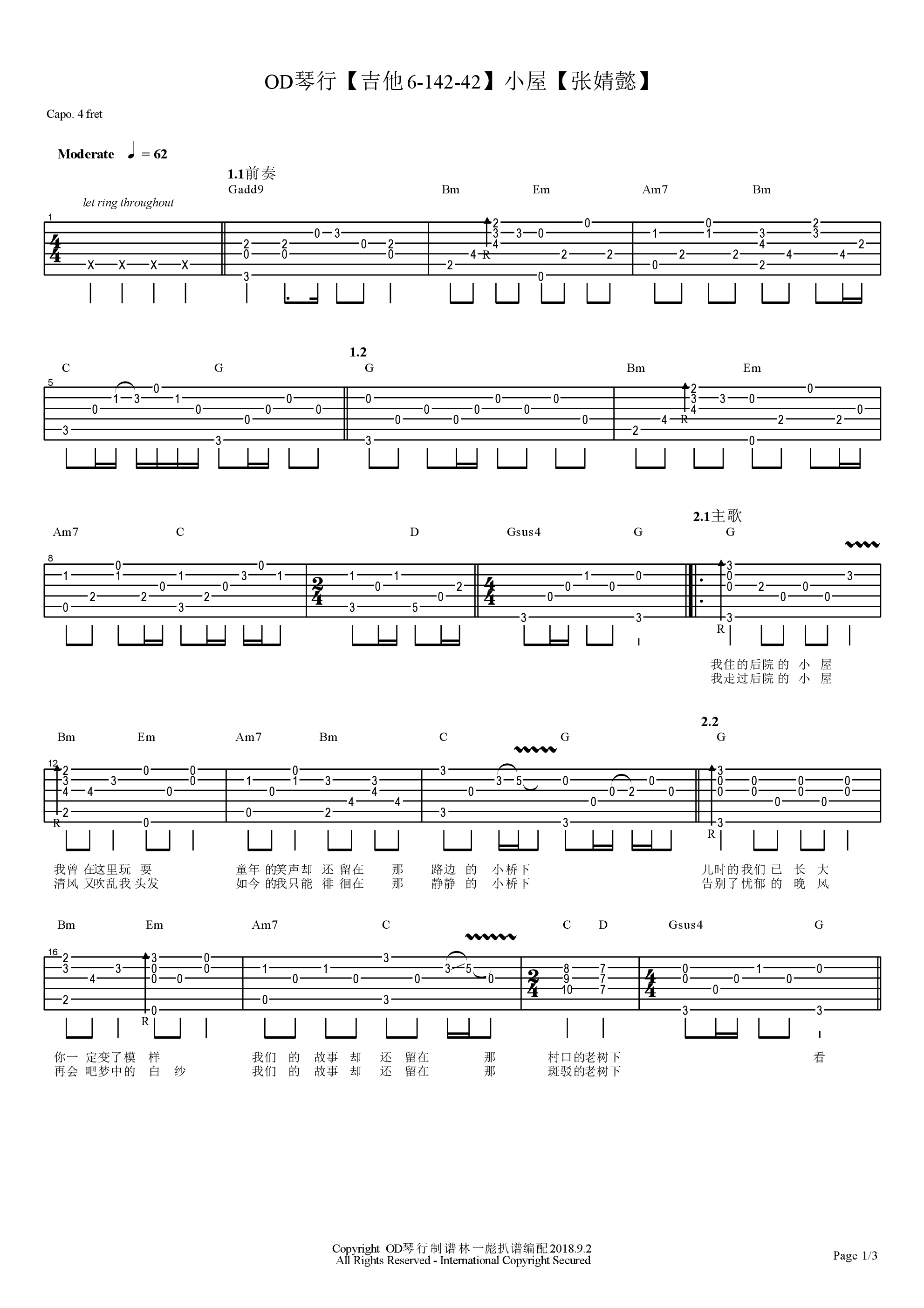张婧懿《小屋》吉他谱,中国好声音的舞台,女生版玫瑰和斑马斑马让张婧懿得到大家的认识和喜爱,这次她推出了自己的新歌单曲,小屋吉他弹唱谱,高清图片谱,Capo夹四品,感谢OD琴行编配出品,琴艺谱网站上传分享...