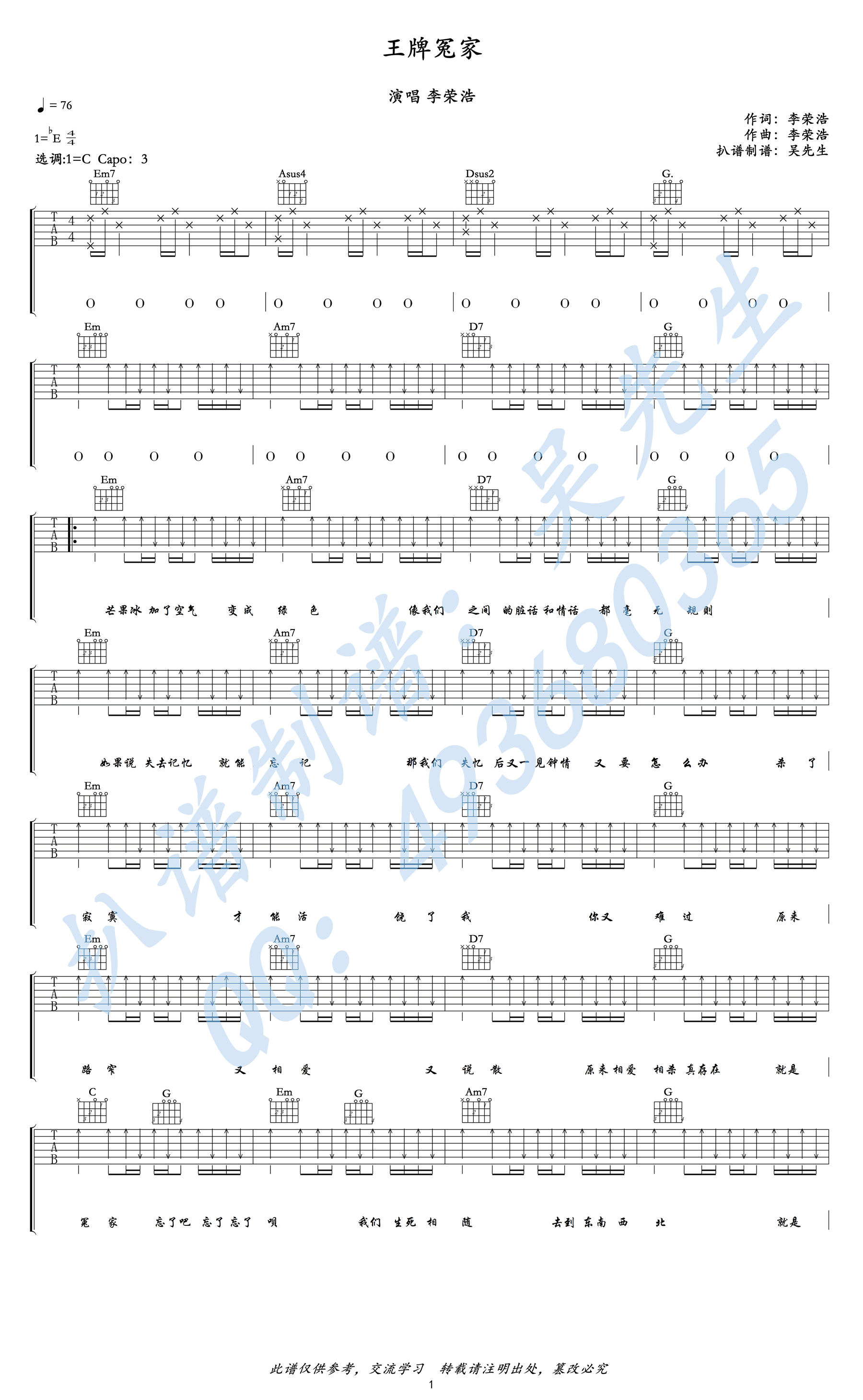 李荣浩《王牌冤家》吉他谱,原调降E,选调C,Capo夹三品,歌曲仿佛都市霓虹灯一般,有着一层泛黄慵懒的色彩风格。王牌冤家六线谱,高清弹唱图片谱,感谢吴先生编配。...