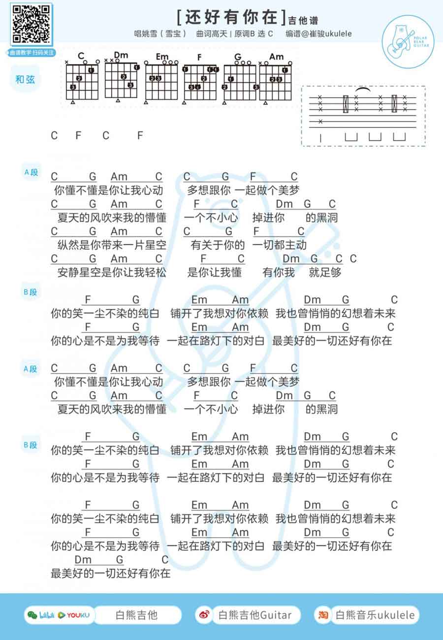还好有你在吉他谱,原调:B,选调C和弦指法编配。...
