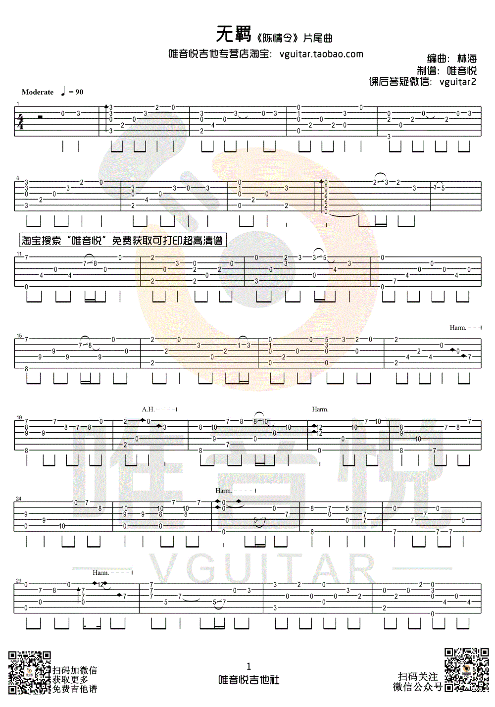无羁指弹谱,电视剧《陈情令》片尾曲,无羁吉他独奏谱,唯音悦编配出品...