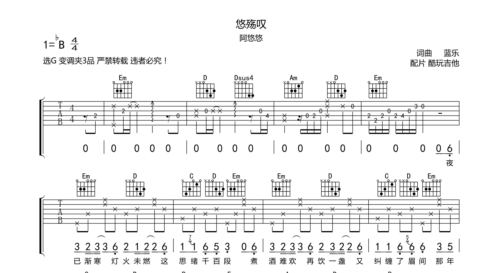 原调Bb选G变调夹3品精力有限故音频为手机录制新歌《悠殇叹》延续了以往阿悠悠的悲情歌路线,更加入了韵味十足的中国风曲调。缓慢暗沉的伴奏,搭配着阿悠悠的磁性烟嗓,瞬间将歌曲中痴情女子于旧亭下,苦等伊人归来的景象浮现眼前。故事感与画面感十足,难怪这首歌曲的能得到众多网友喜爱,光速拿下...