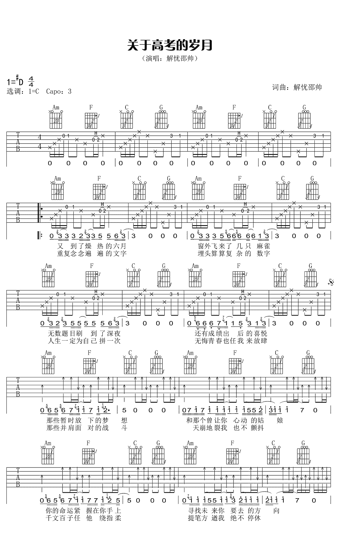 吉他关于高考的岁月吉他谱-解忧邵帅