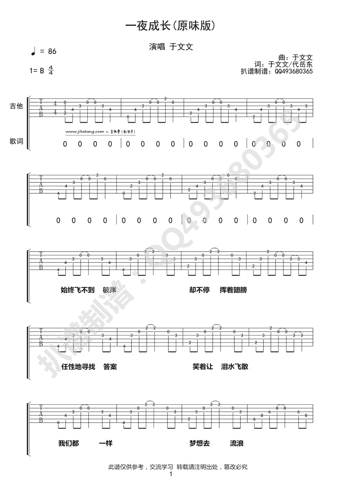 一夜成长吉他谱,曲谱选B调和弦编配。...