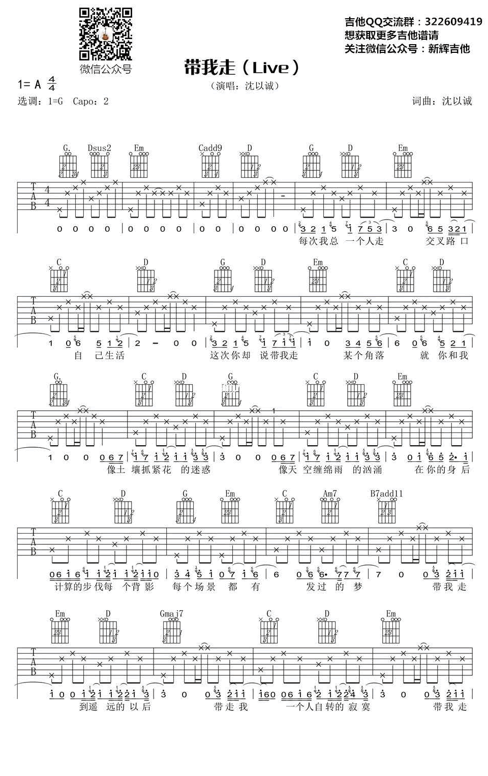 吉他带我走吉他谱_沈以诚