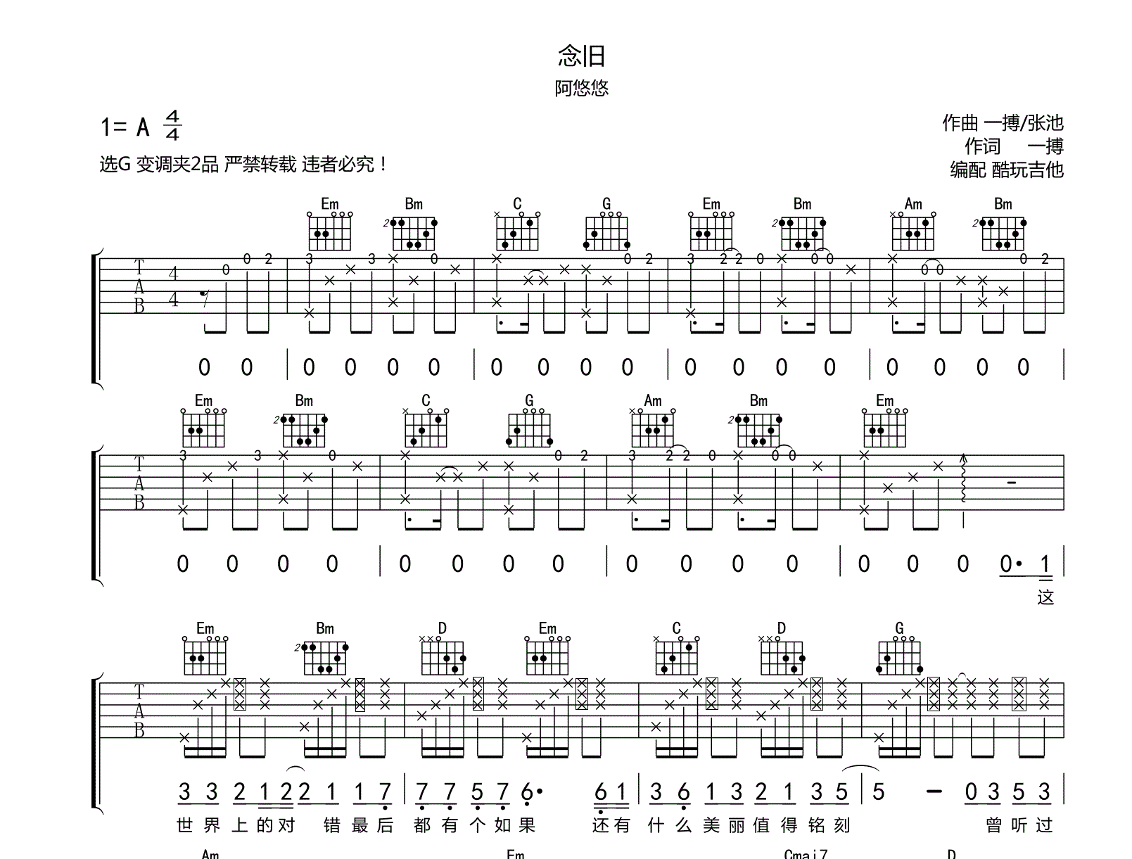 吉他念旧 吉他谱 阿悠悠 还原版