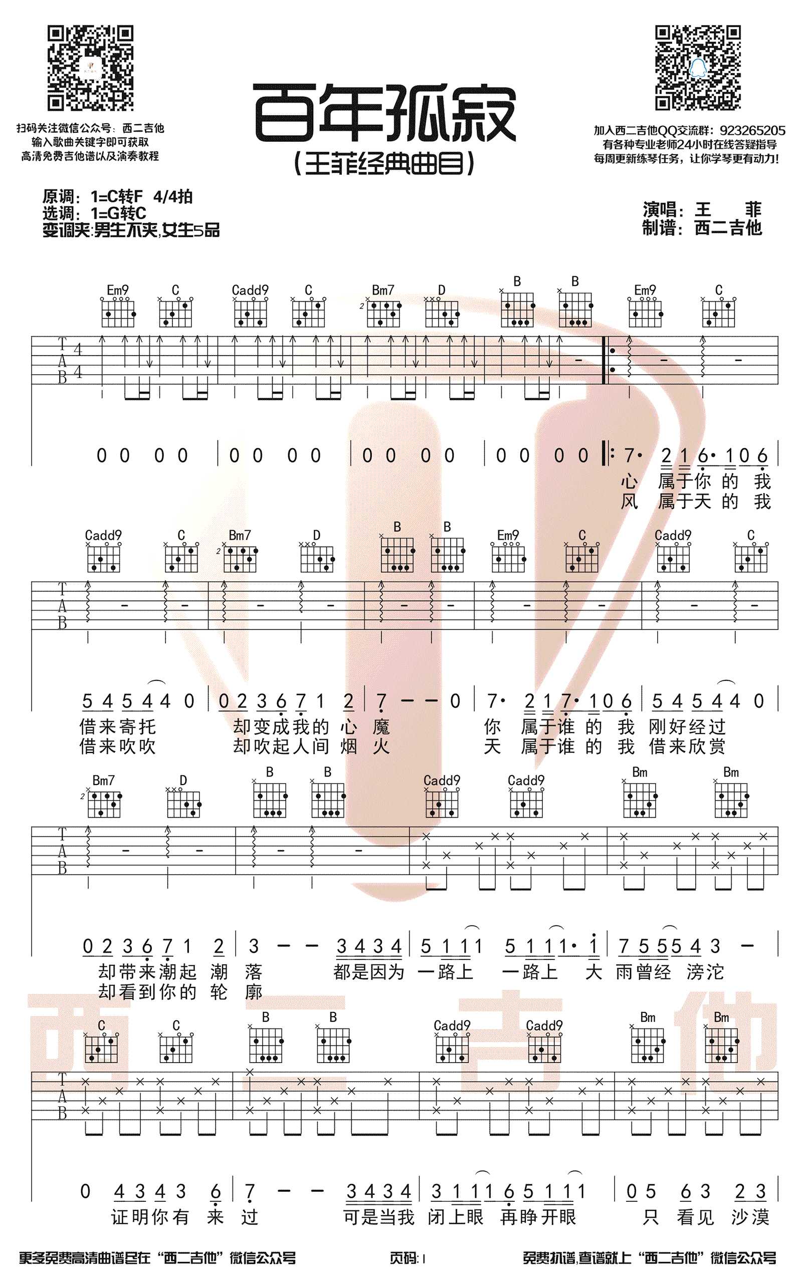 吉他百年孤寂吉他谱 王菲