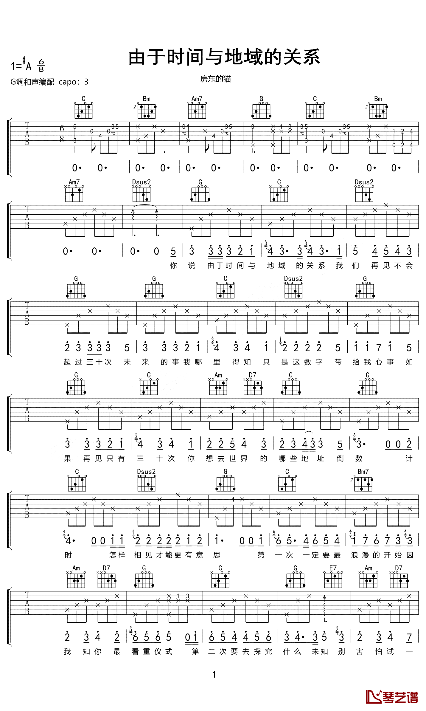 吉他由于时间与地域的关系吉他谱 房东的猫