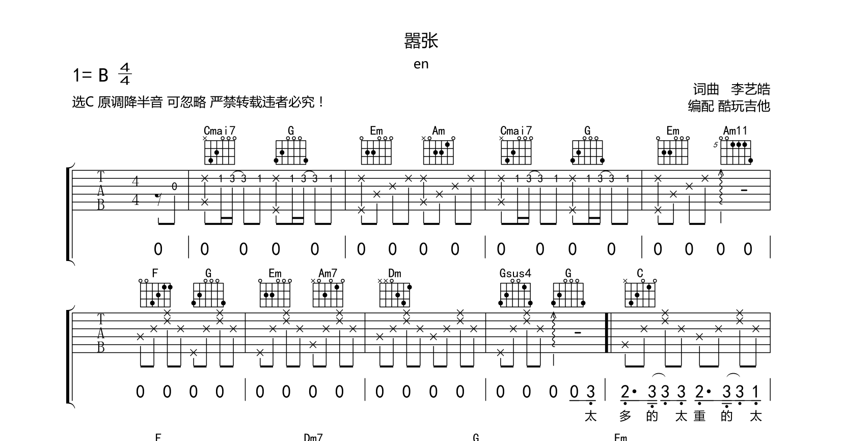 嚣张吉他谱en附带完整前奏间奏尾奏原调B选C调编配需要原调弹唱请把吉他弦降半音可忽略...