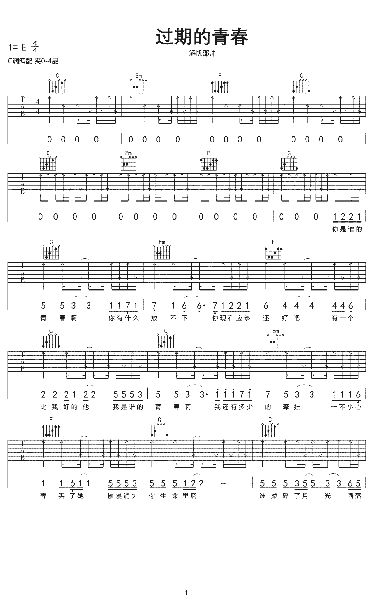 过期的青春吉他谱-解忧邵帅原调1=E,曲谱选调C和弦编配,变调夹根据自己的音域0-4品。...