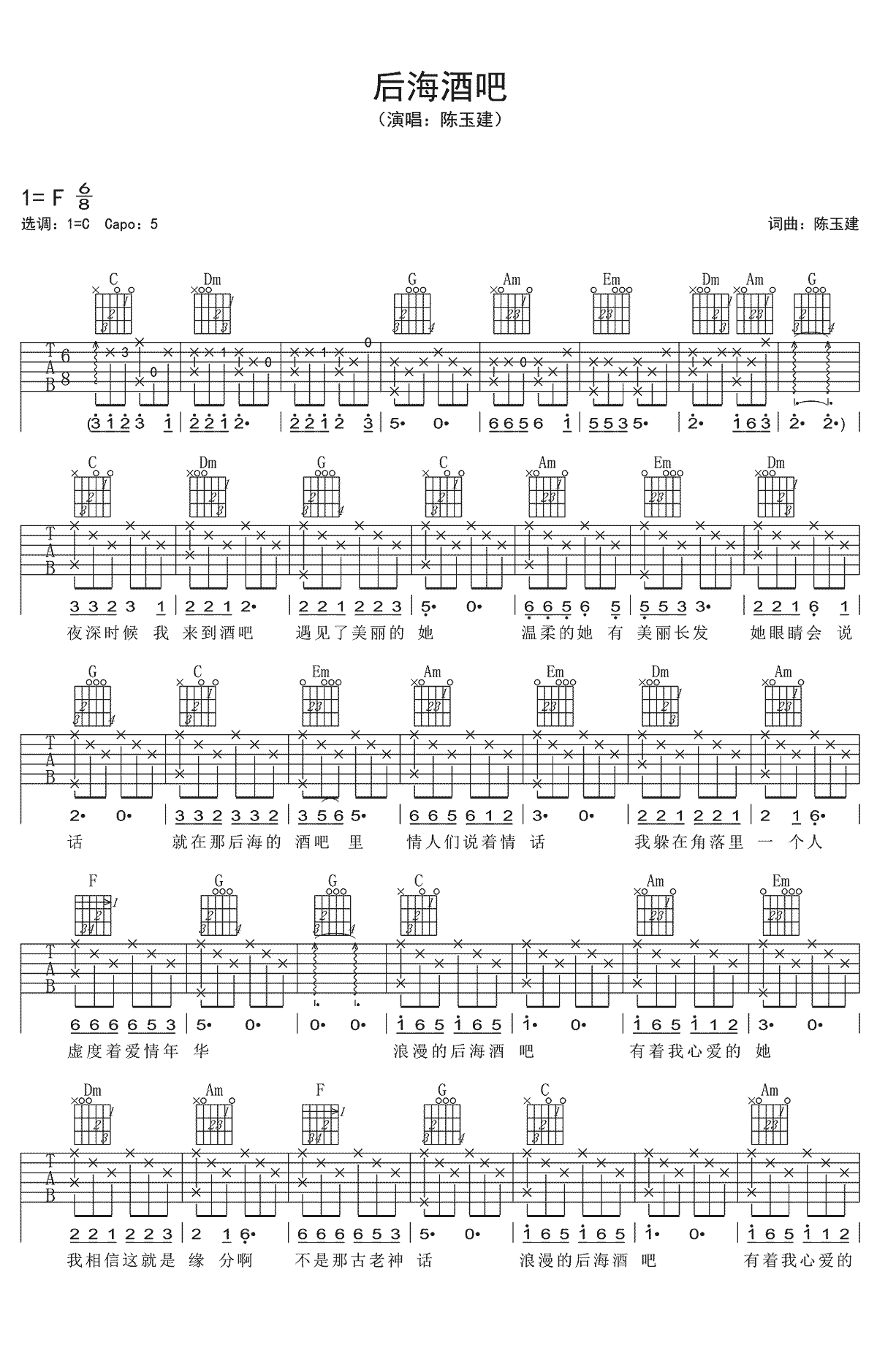 后海酒吧吉他谱-陈玉建原调:F,本谱选:1=C调和弦指法编配。...