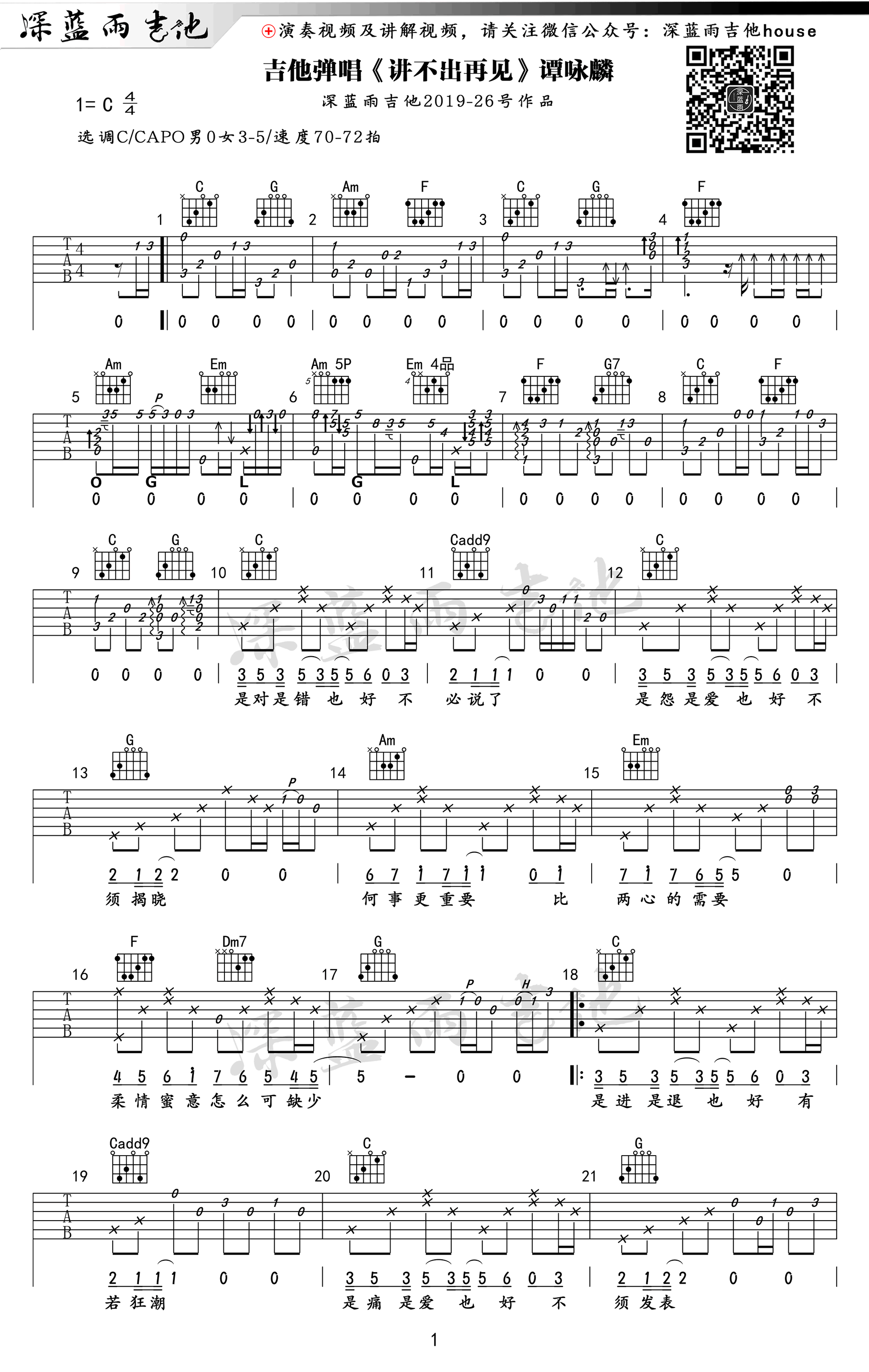 讲不出再见吉他谱_谭咏麟C调指法,深蓝雨吉他编配...