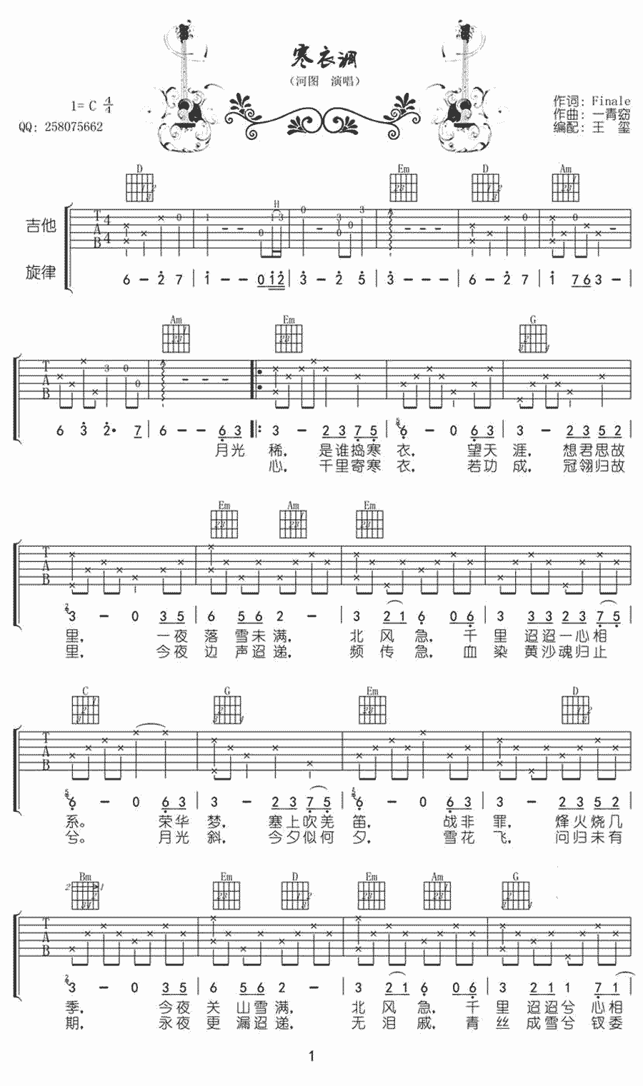 寒衣调吉他谱-河图曲谱选原调:1=C和弦指法编配。...