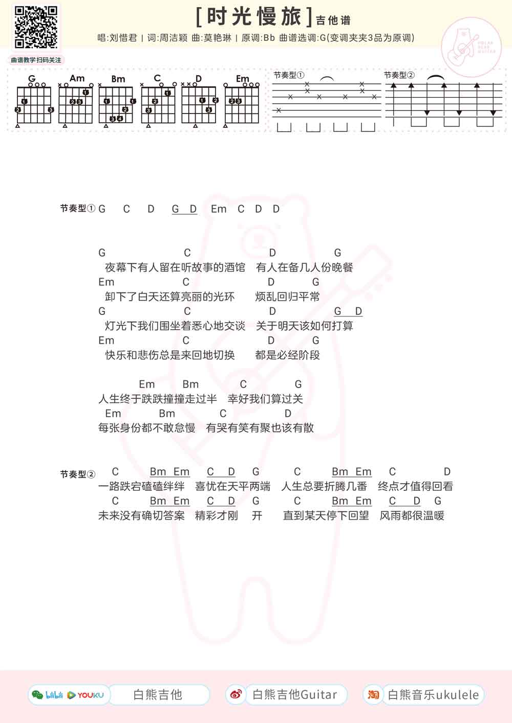 时光慢旅吉他谱-刘惜君原调降B,选调:1=G和弦指法编配,变调夹3品。...