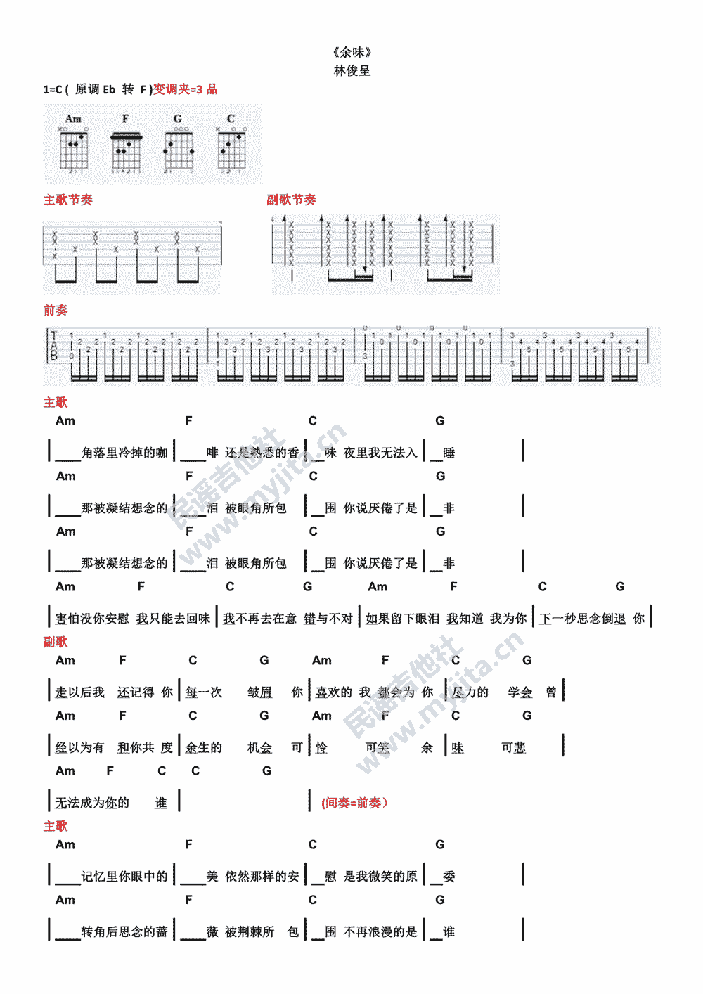 余味吉他谱-林俊呈原调:降B转F,选C调和弦指法编配,变调夹=3品。...