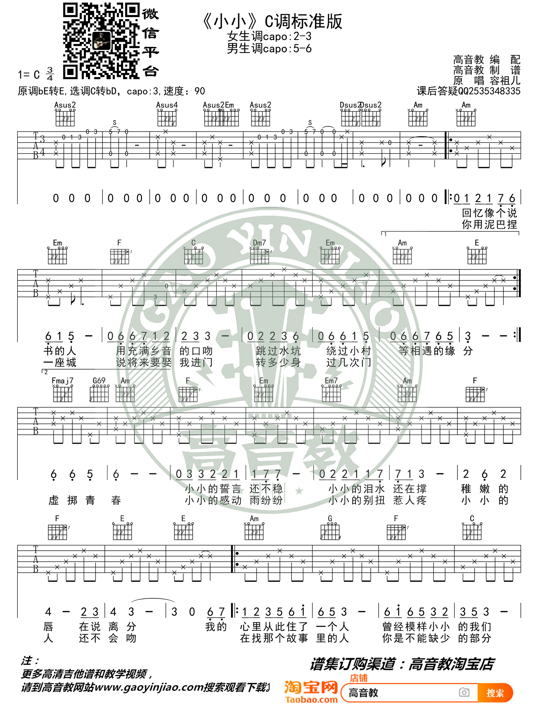 小小吉他谱容祖儿原调Eb转E选C转C#变调夹3品...