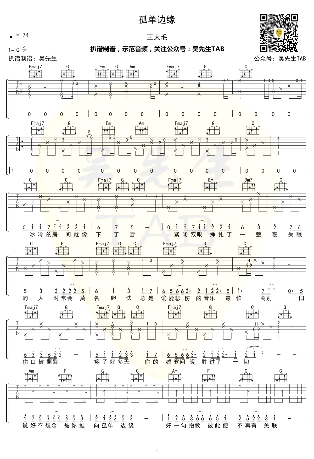 孤单边缘吉他谱王大毛网络人气主播王大毛吴先生编配扒谱...
