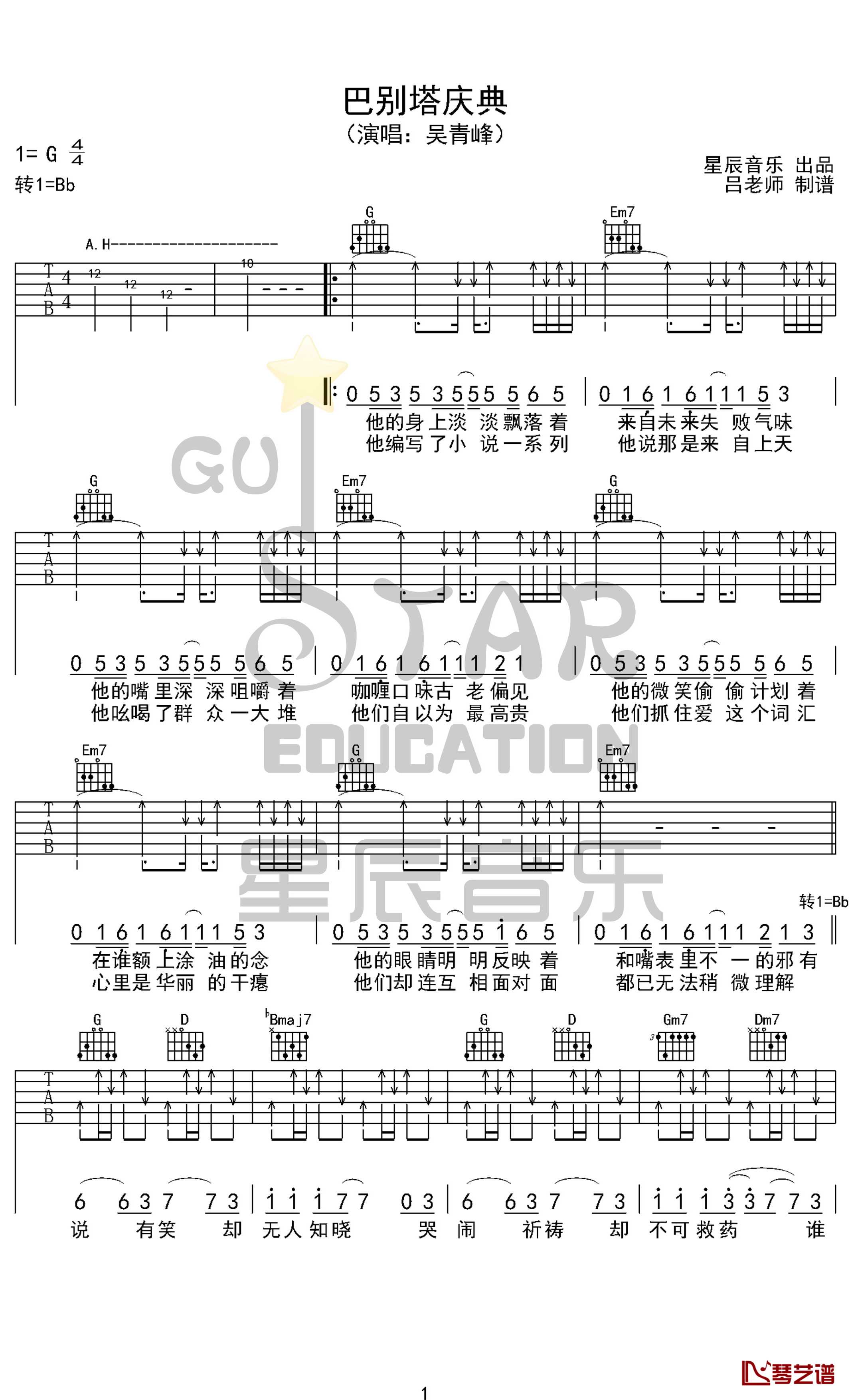 巴别塔庆典吉他谱吴青峰原调G调,转1=Bb调,本歌曲采用原版编配,感谢星辰音乐出品...