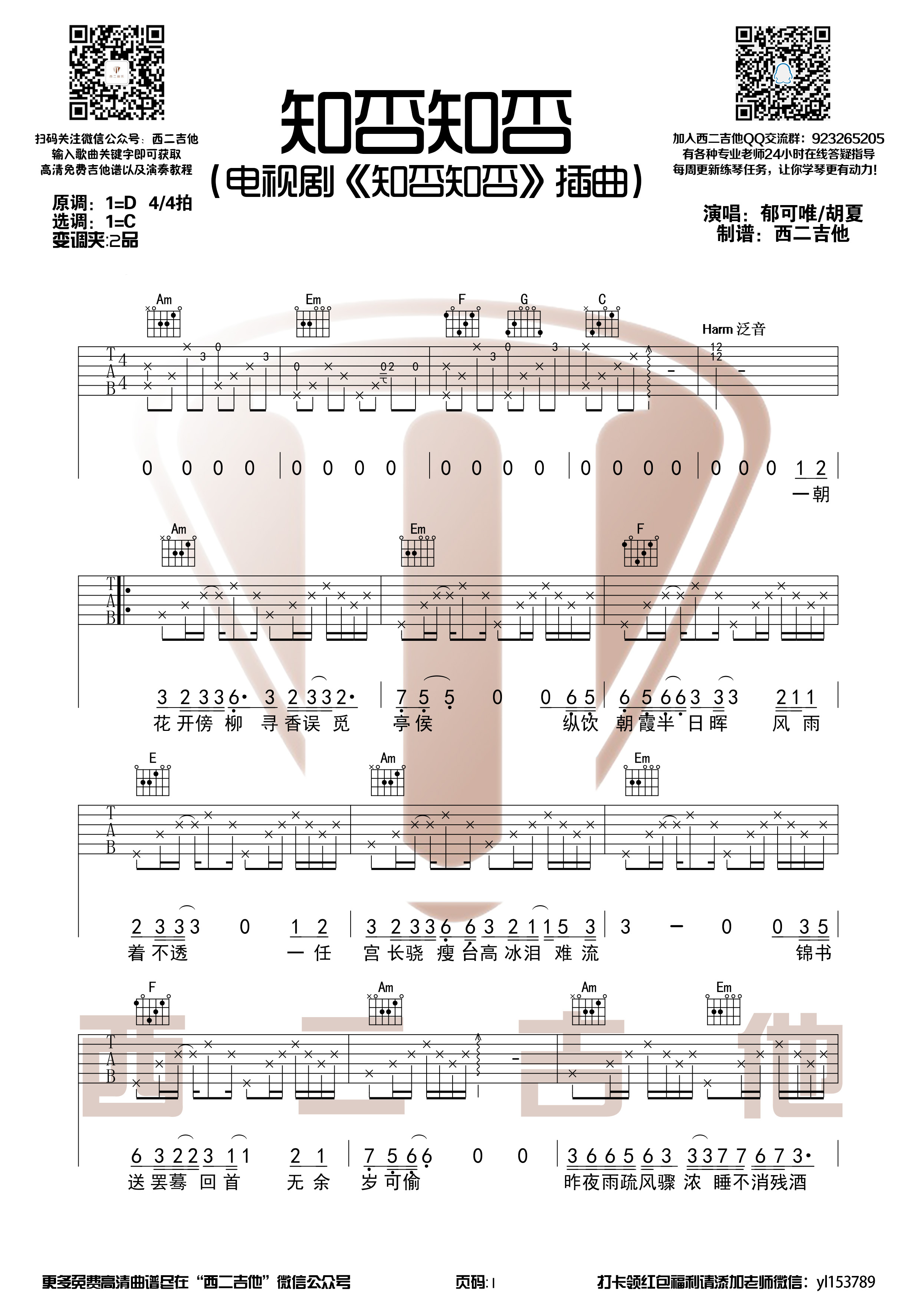 胡夏/郁可唯《知否知否》吉他谱原调D选C变调夹2品...