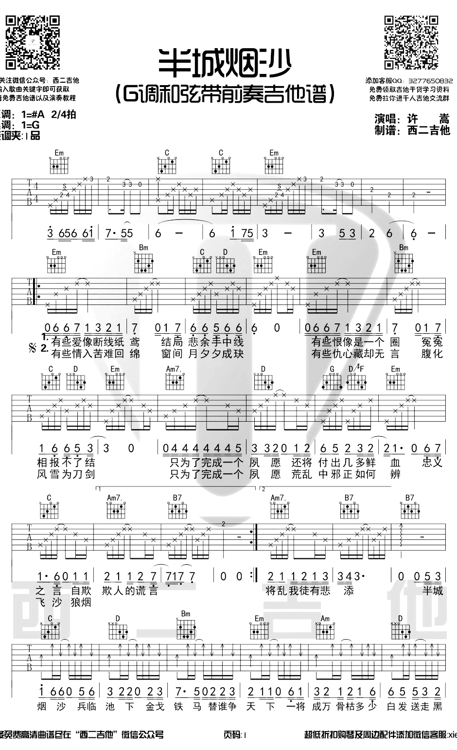 半城烟沙吉他谱许嵩原调A调,2/4拍,变调夹夹1品,选用G调和弦编配,带前奏...