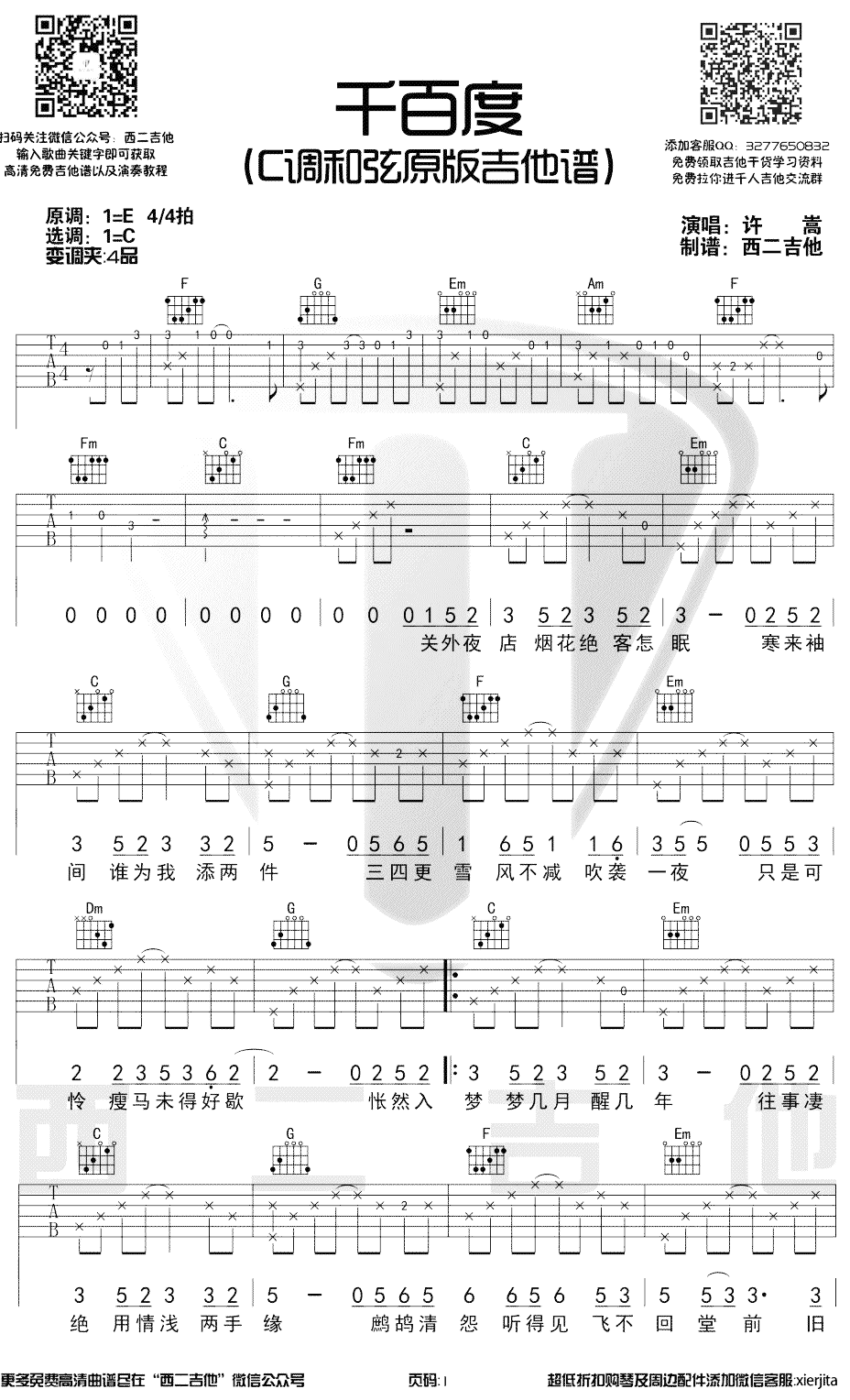 千百度吉他谱许嵩原调E调,变调夹需要加在四品,歌曲采用C调和弦编配...