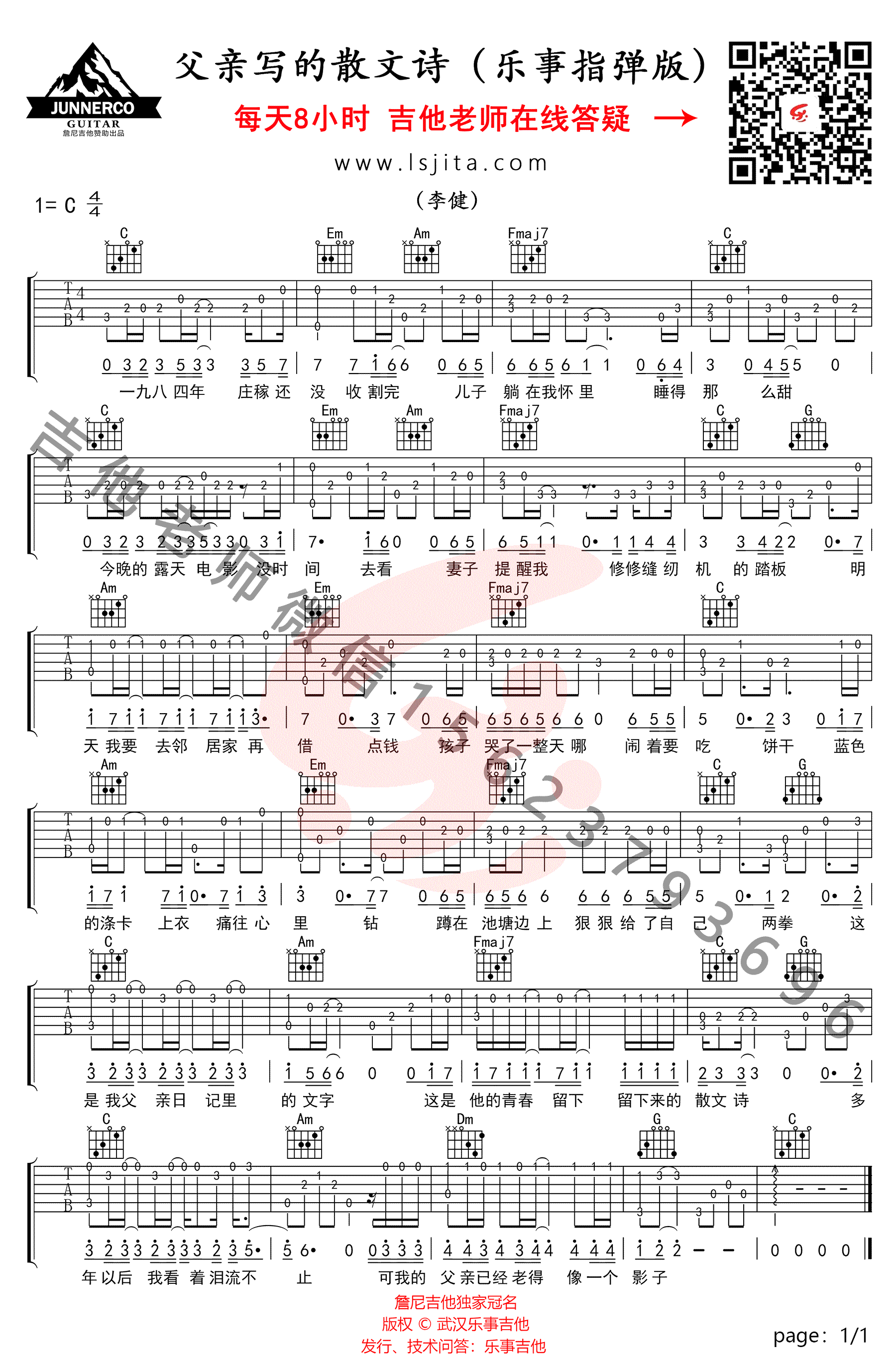 父亲写的散文诗指弹谱,父亲写的散文诗吉他独奏谱,C调指法...
