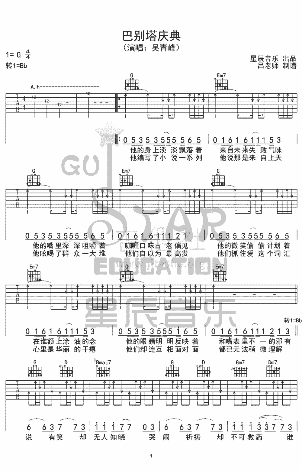 巴别塔庆典吉他谱-吴青峰曲谱选G转降B调和弦指法编配。...