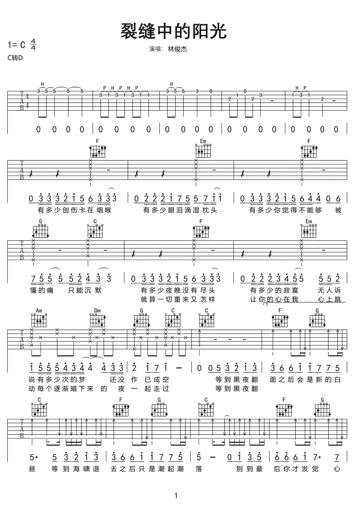 裂缝中的阳光吉他谱-林俊杰曲谱选调:C转D和弦指法编配。...