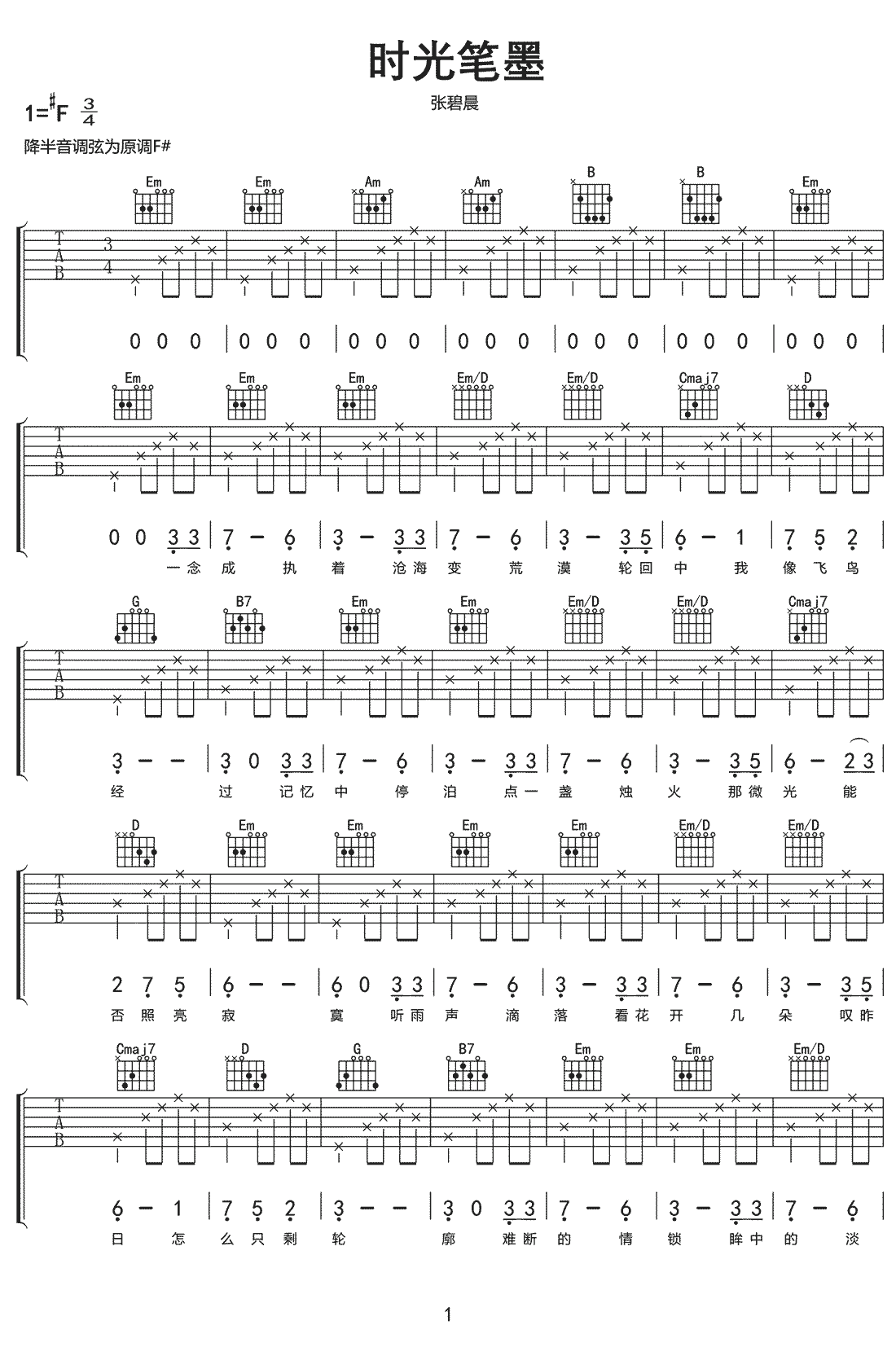 时光笔墨吉他谱-张碧晨原调:1=#F,本曲谱选G和弦指法编配。...