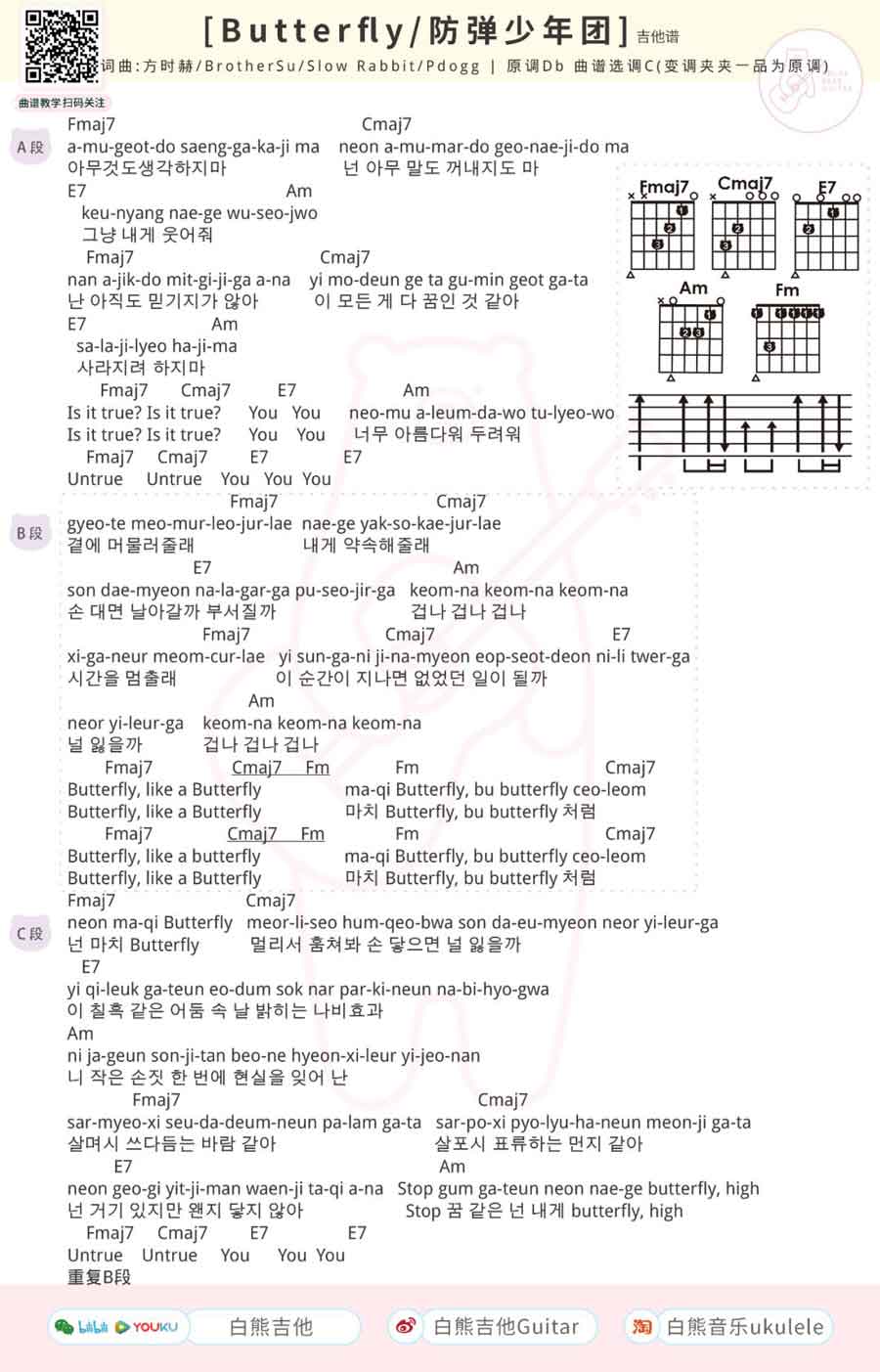 Butterfly吉他谱-BTSTS原唱,曲谱原调降D,选C调和弦指法编配。...