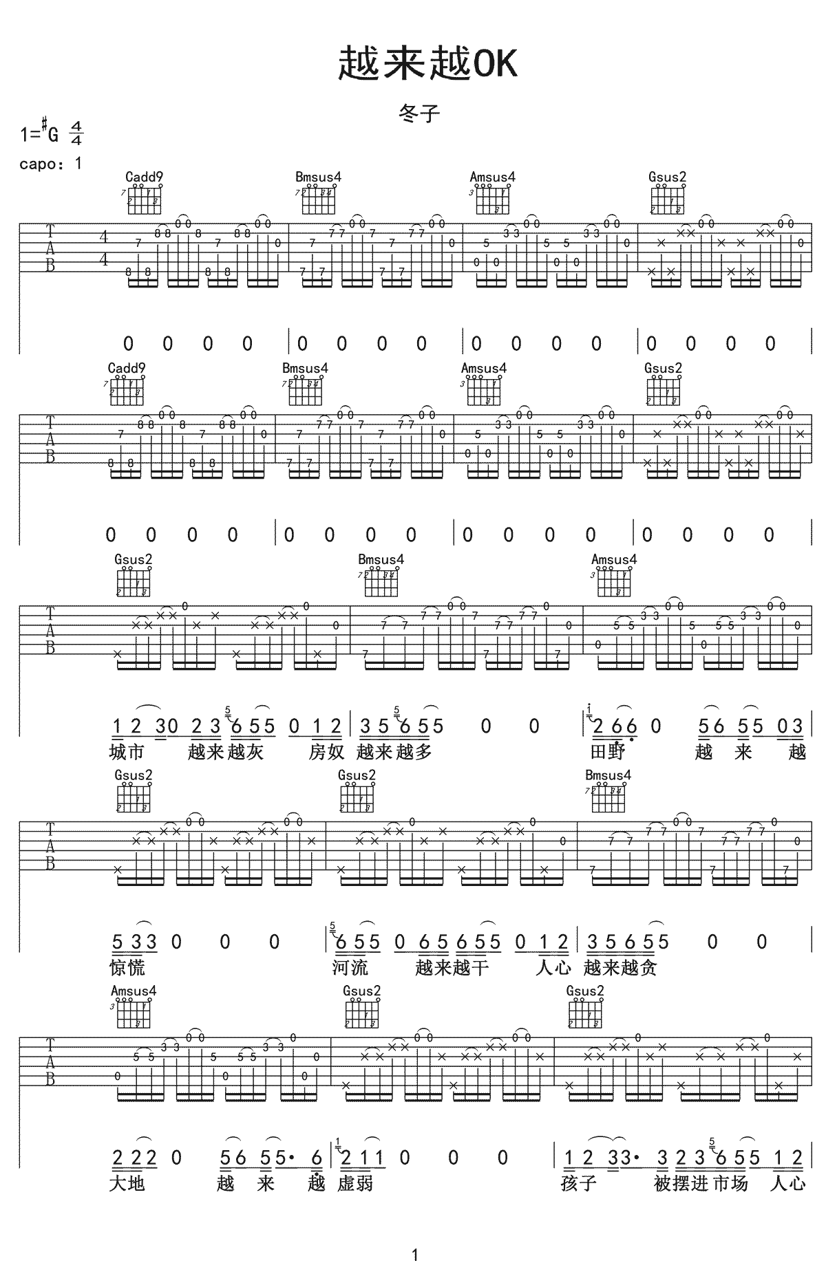 越来越OK吉他谱-冬子原调:1=#G,本谱选调:1=G,(CAPO1品)。...